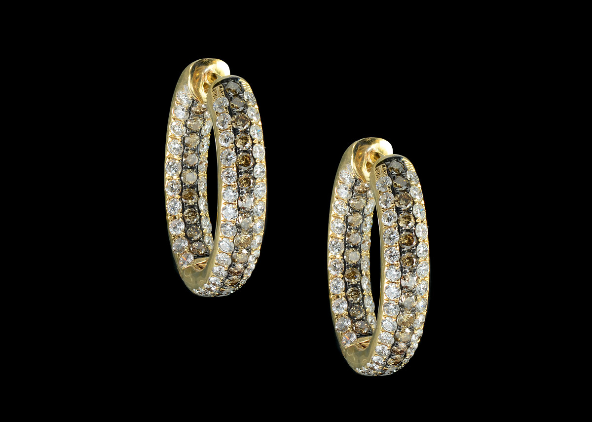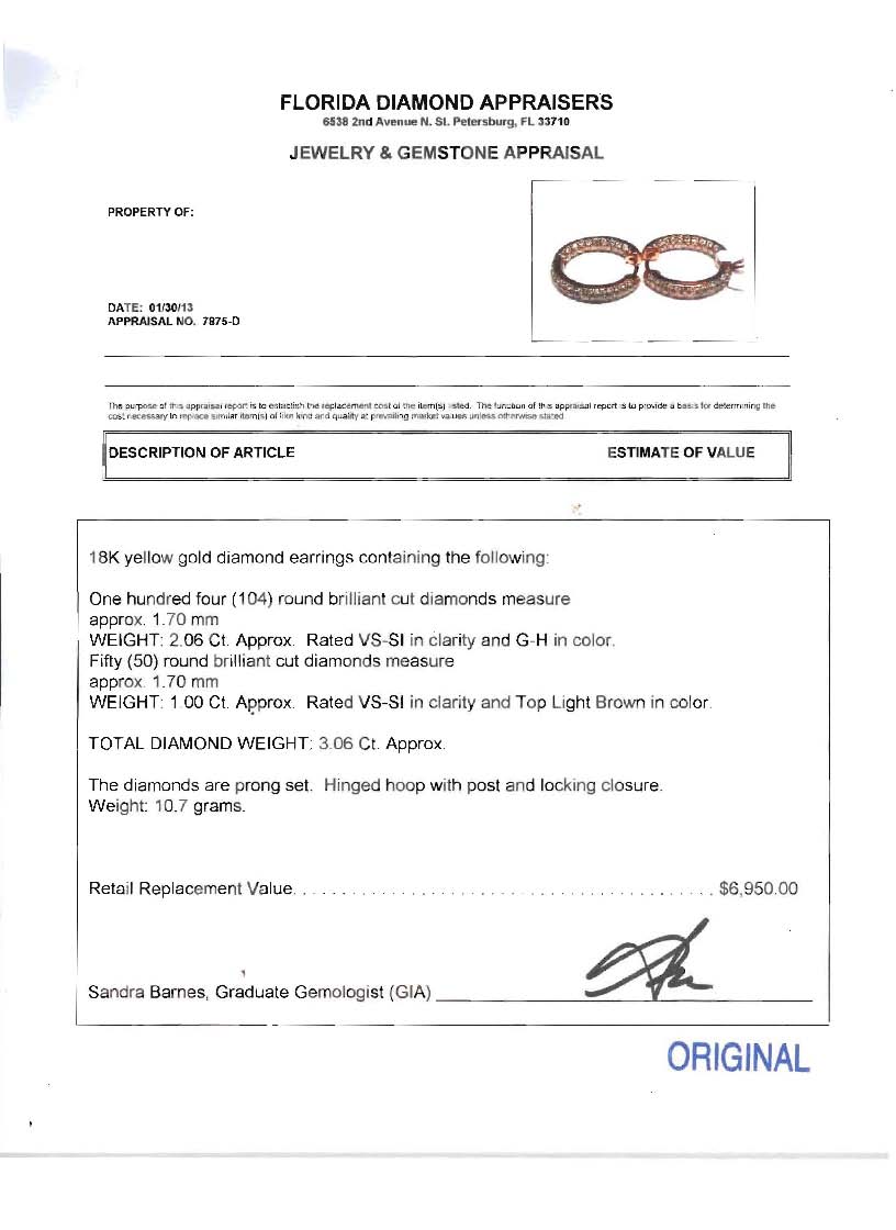 3.06 CTW DIAMOND HOOP EARRING: 18K yellow gold hinged hoop earrings of 159 round brilliant diamonds totaling approx. 3.06 Ct., averaging VS-SI clarity and G-H and top light brown color. Prong set. Post and locking closure. Diameter: .75''. Weight: 10.7 grams. Sold with current Florida Diamond Appraisers GIA graduates appraisal for $6950.