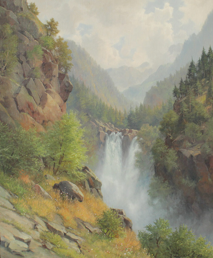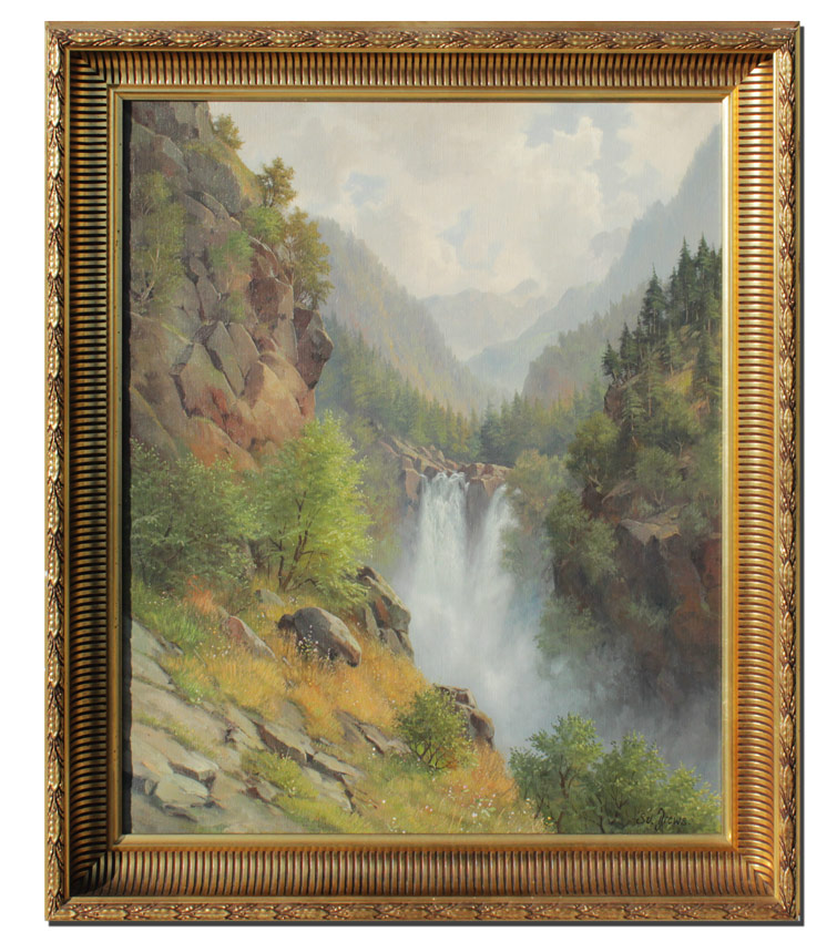 DREWS, Svend, (Danish, 1919-2003): Waterfall Landscape, Oil/Canvas, 25 3/4'' x 21 3/4'', signed lower right, gilded frame with minor wear, 31'' x 26 3/4''.