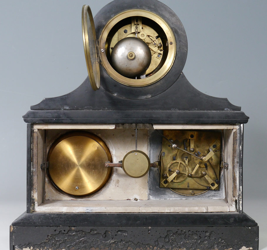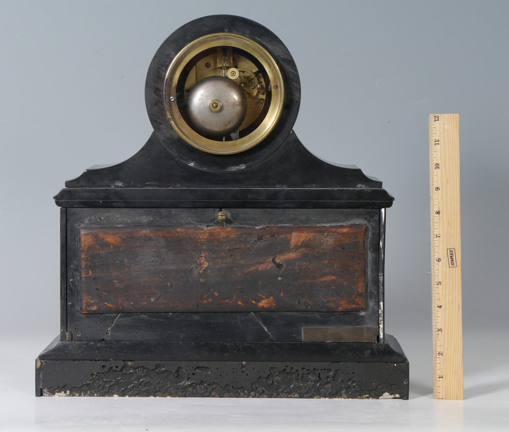 FRENCH SLATE MANTLE CLOCK WITH BAROMETER: Black slate case with 3 separate porcelain dials and thermometer. Top dial is the clock with Roman numerals and open escapement. Unsigned French time and strike movement. Lower dials include one with date, day and month secondary dials; the other is aneroid barometer. Central thermometer with Fahrenheit temperature. Overall measures 14 1/2'' h. x 16'' x 5 1/2''. Key and pendulum in office.