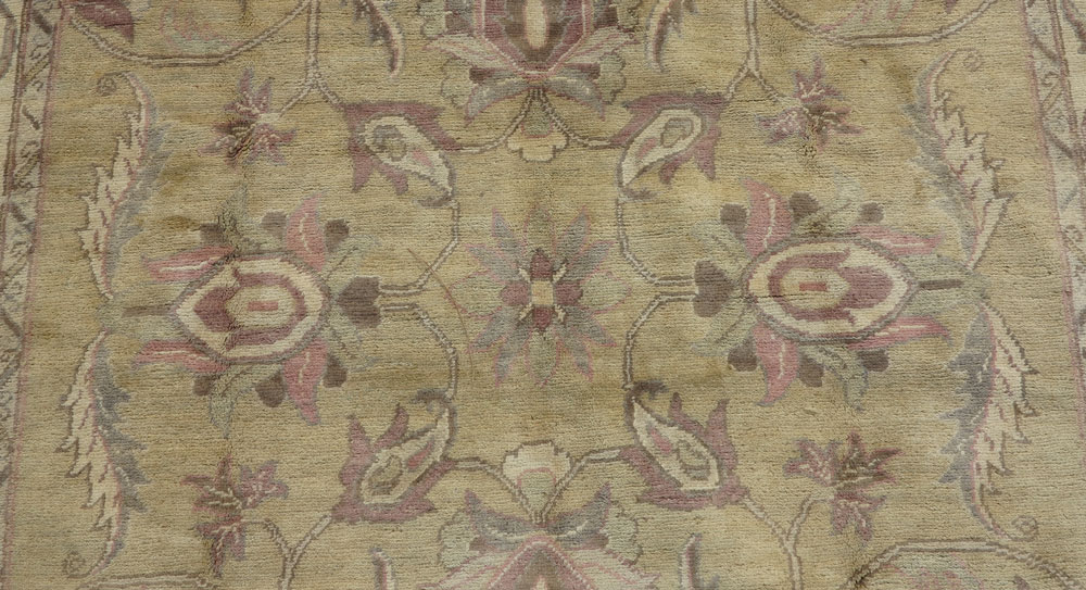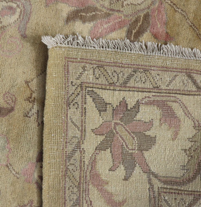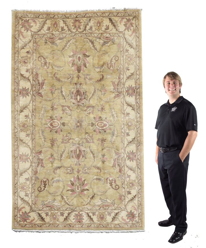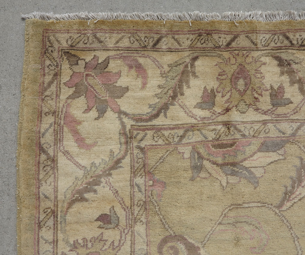 MODERN PAKISTANI HAND KNOTTED WOOL RUG, 5' 11'' x 8'2'': This pastel toned rug has an unusual palette on a pale yellow gold field. On the field are found large size palmettes and two tone leaves in colors of pink, grey, pale green, ivory, and brown. The same motifs are found on the ivory ground main border. This softly toned rug would look good in a bedroom or a ladies study/office. Condition is good.
