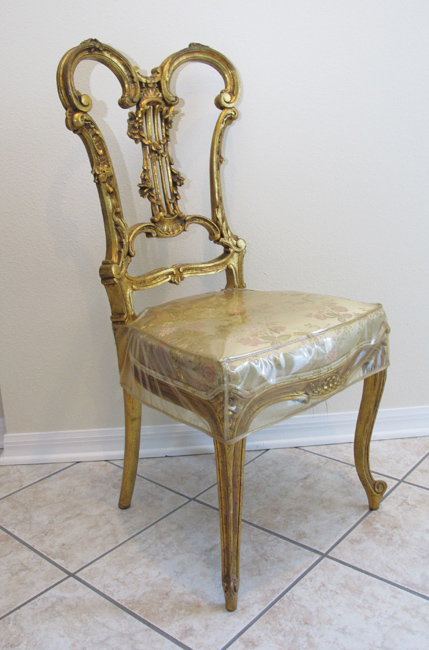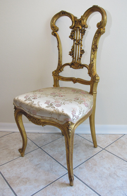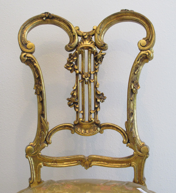 CONTINENTAL CARVED GILT WOOD ROCAILLE CHAIR: Elegant carved back with floral motifs and open work design. Carved and shaped legs. Floral cushion. 38'' h. x 17 1/2'' x 17 1/2''.