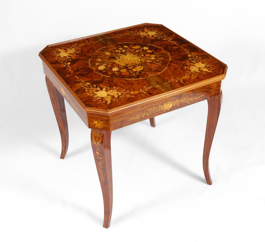 ITALIAN MARQUETRY INLAID GAME TABLE: 20th century production, profuse floral marquetry on removable top, backgammon board verso. Second level with green felt card playing surface, chess board verso. Lowest level with roulette board sliding open to reveal roulette wheel. Inlaid skirt and shaped legs. 29 1/2'' h. x 30 1/2'' square.