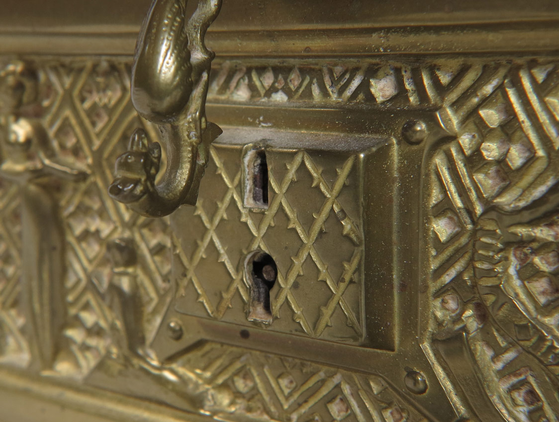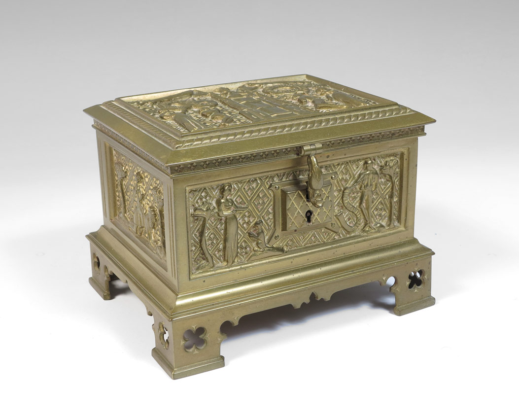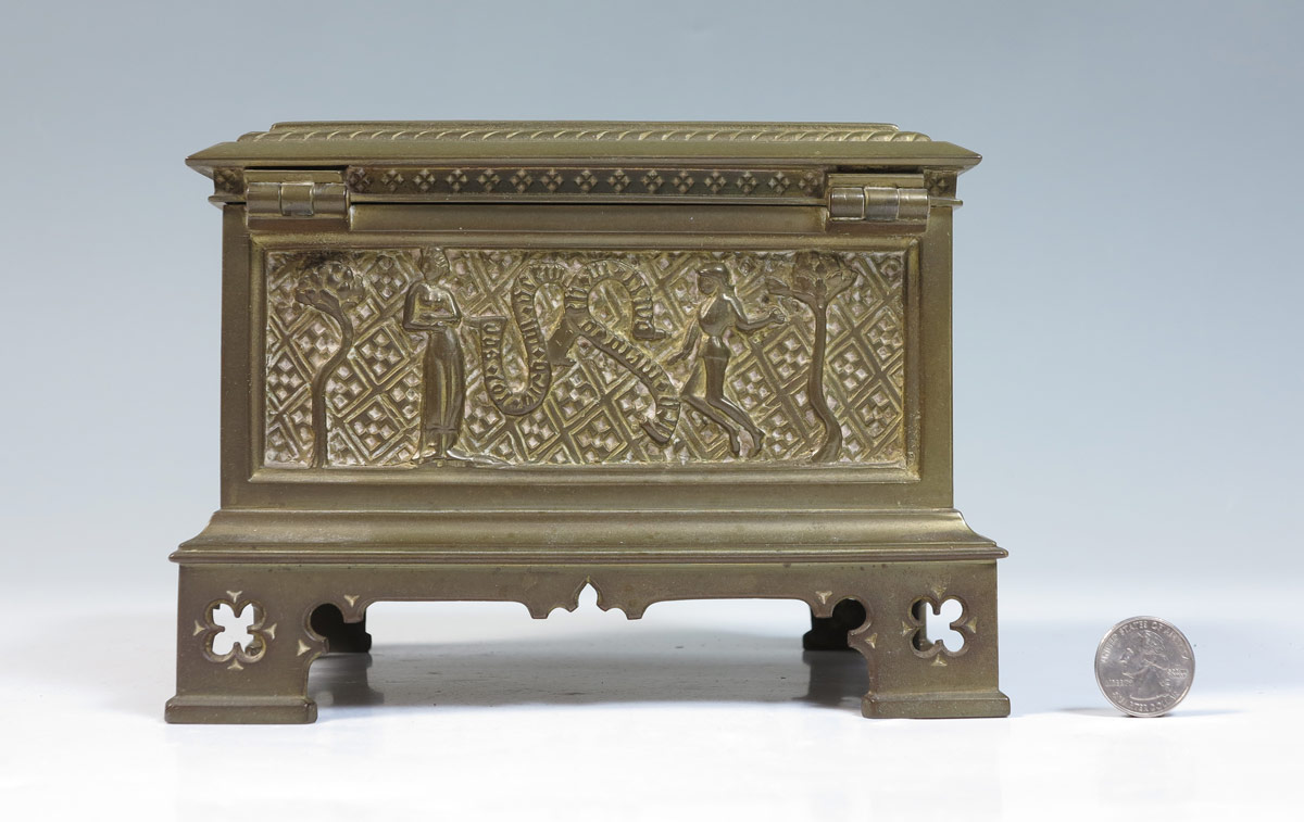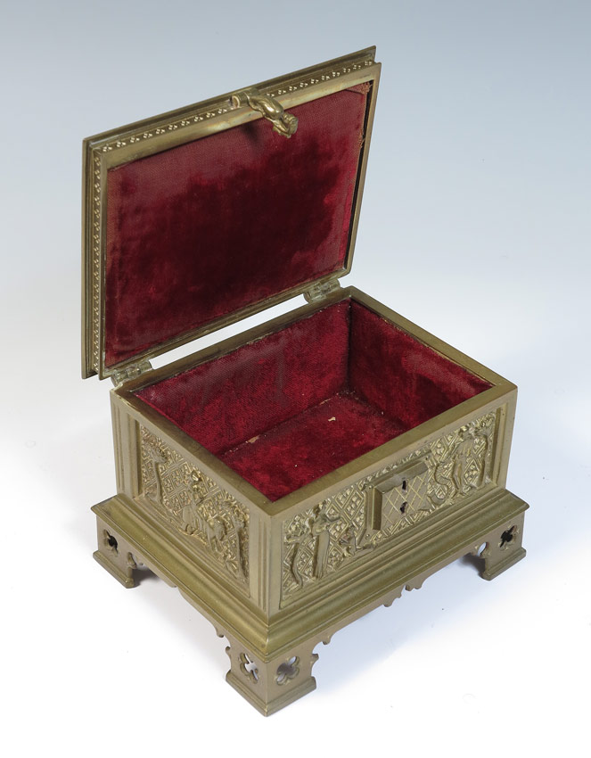 EMBOSSED BRONZE JEWEL CASKET: Embossed hinged lid and sides with neo-classical motifs, velvet lined interior. Unmarked as to maker. Measures 5 3/4'' h. x 8'' x 6 1/2''.