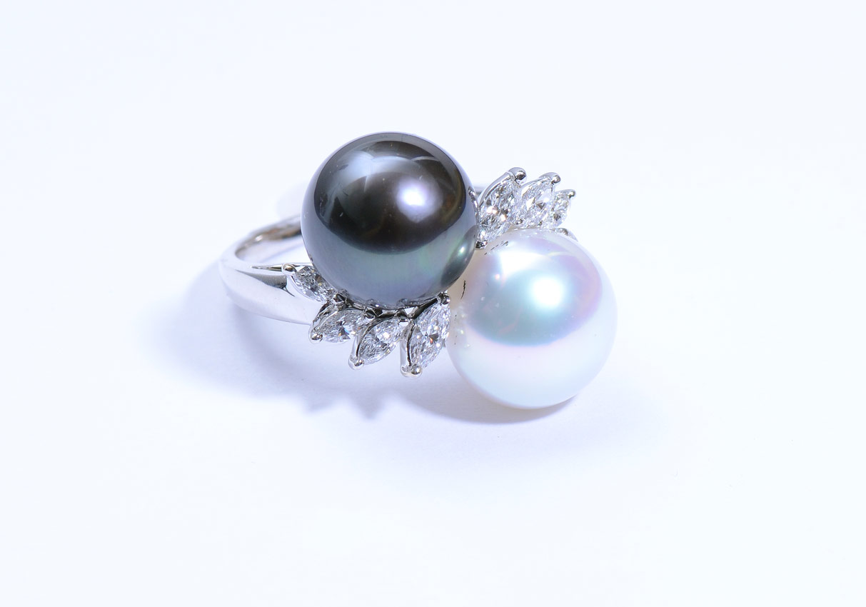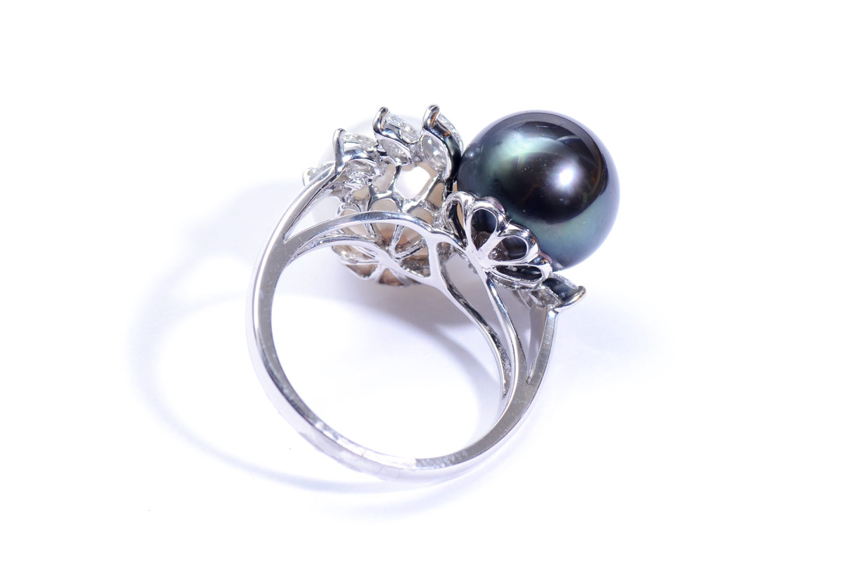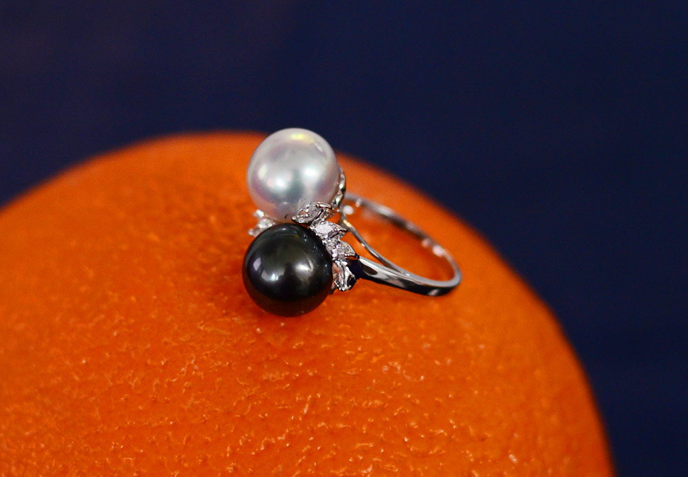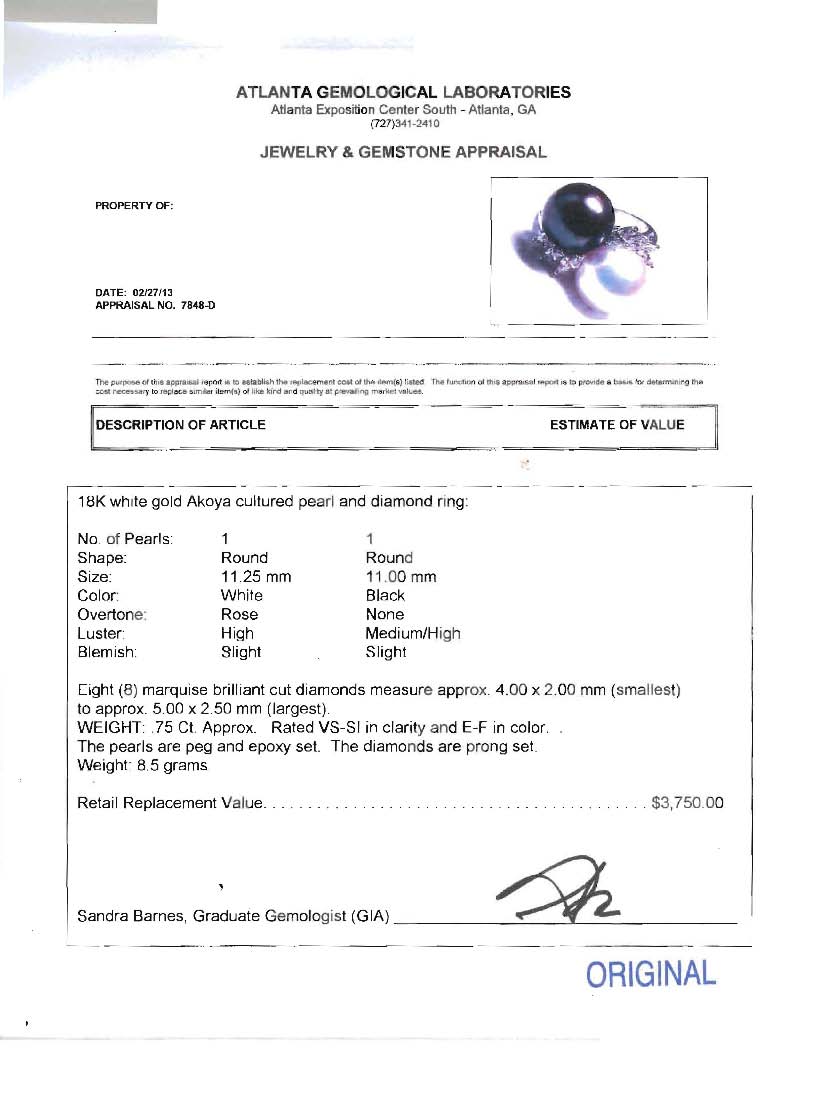 AKOYA CULTURED PEARL RING: 18K white gold ring with 2 pearls in a swirl of diamonds. Pearls are one black, 11 mm and one white, 11.25 mm, with rose overtones. The 8 marquise diamonds total approx. .75 Ct., average VS1-SI, color E-F. Pearls are peg and epoxy set. Diamonds are prong set. Size 5.5. Weight 8.5 grams. Sold with current Atlanta Gemological GIA graduates appraisal for $3750.