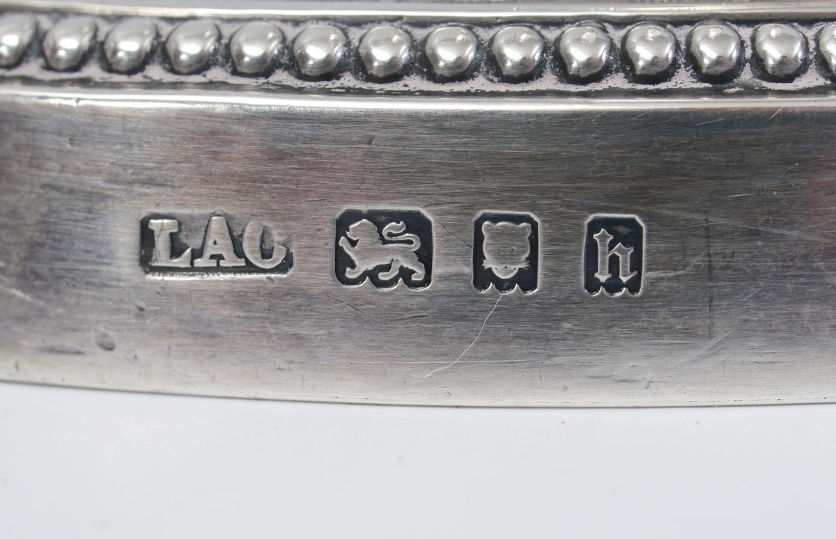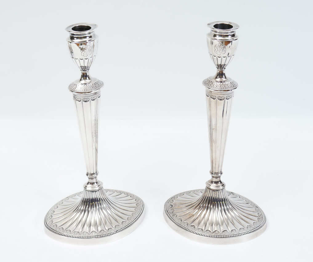 PAIR CRICHTON ENGLISH STERLING CANDLESTICKS: Pair of single light candlesticks by Crichton & Co., London, 1923. Embossed designed. Monogrammed, 12'' h., heavily weighted sterling.