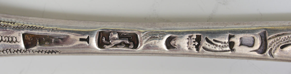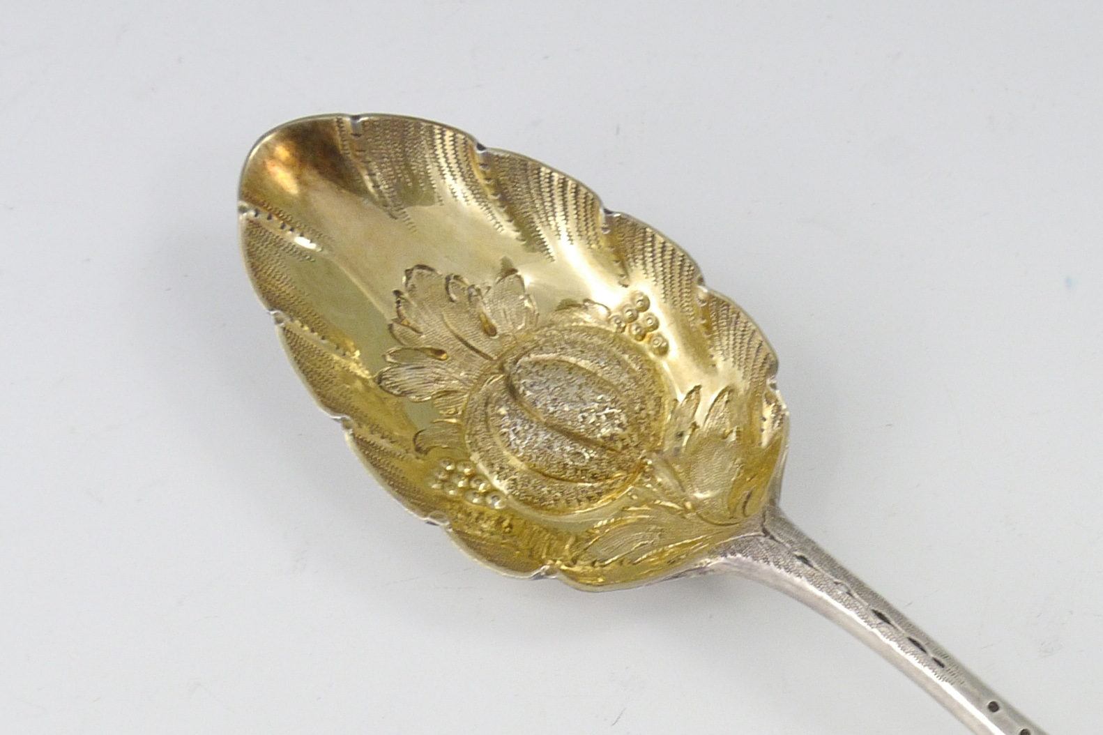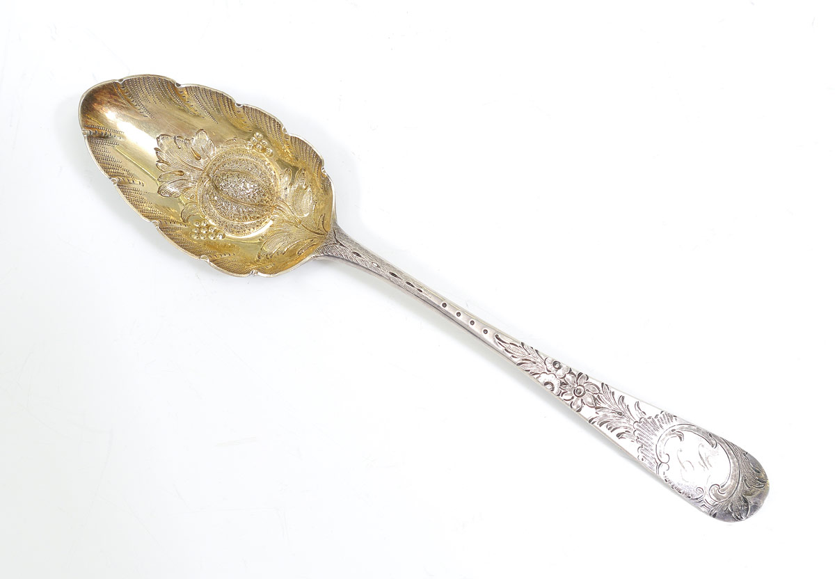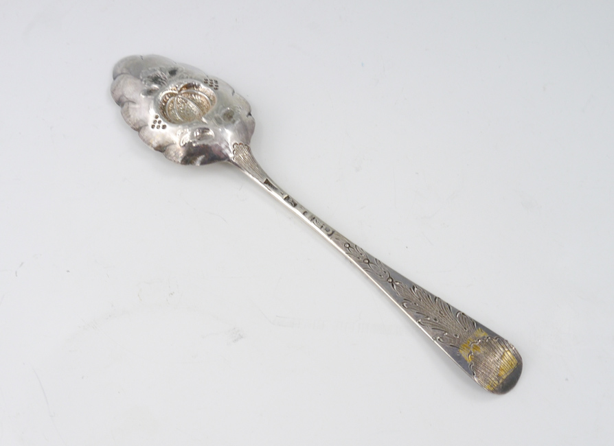 GEORGIAN ENGLISH SILVER BERRY SPOON: 1769 London hallmarks with illegible makers hallmark. Engraved finial and shaft with vermeil repousse and engraved bowl. Measures 8 3/4'' l., approx. 2.4 troy oz.