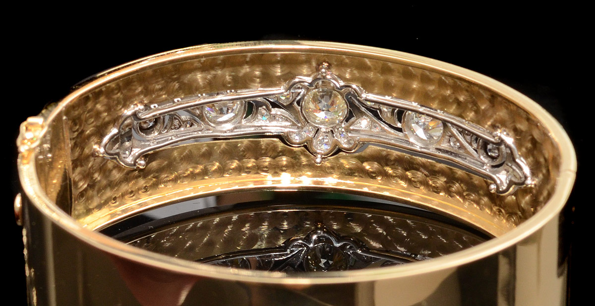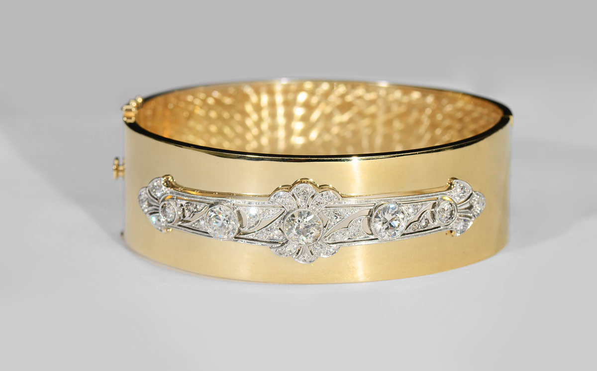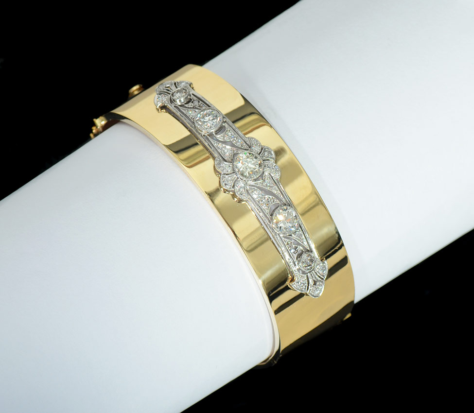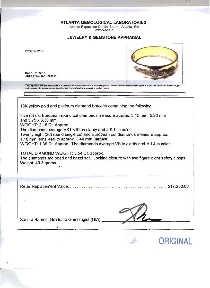 HAND CRAFTED 3.54 CT DIAMOND BANGLE BRACELET: 18K yellow gold hinged bangle bracelet with a filigree platinum plaque containing 5 old European round cut diamonds totaling 2.18 Ct. and 28 round single cut and European cut diamonds totaling an additional 1.36 Ct. The larger diamonds are rated VS1-VS2 clarity and J-K-L color. The smaller are VS clarity and H-I-J color. Interior diameter: 2.25''. Weight 40.3 grams. Sold with current Atlanta Gemological GIA graduates appraisal for $17,250.