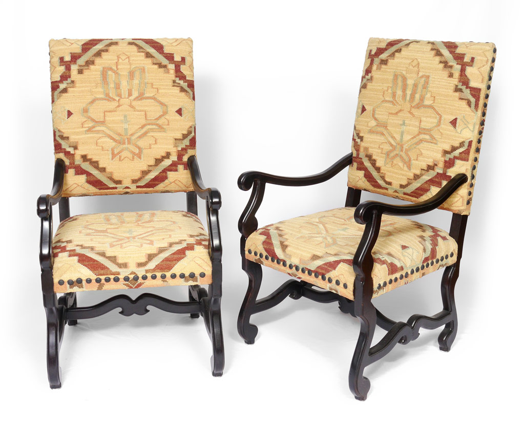PAIR THRONE CHAIRS: Fully upholstered and tacked back and seat. Shaped arms, legs and supports. 46 3/4'' h. x 24'' x 26''.