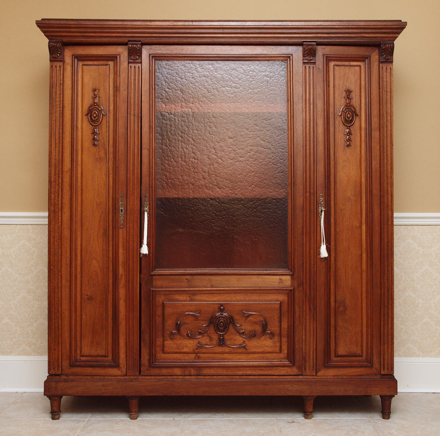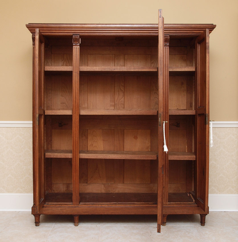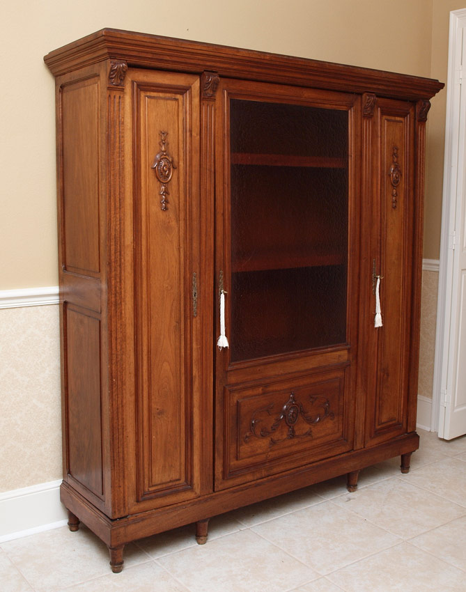 CARVED WALNUT TRIPLE DOOR BOOKCASE: Central door with rose glass insert over panel with applied decoration. Surmounted by 2 wood doors with applied decoration, 3 interior shelves. 67 3/4'' h. x 62 1/4'' x 18''.