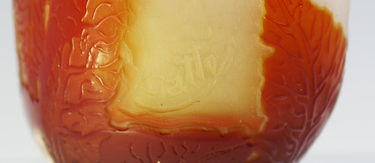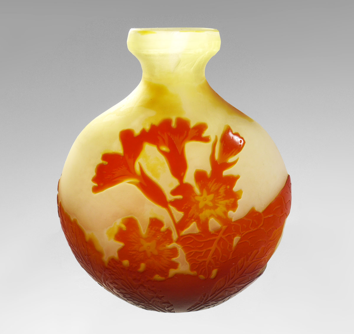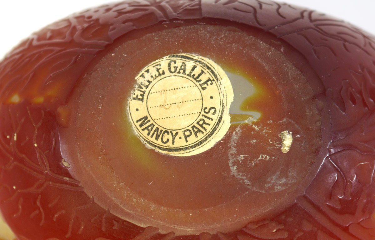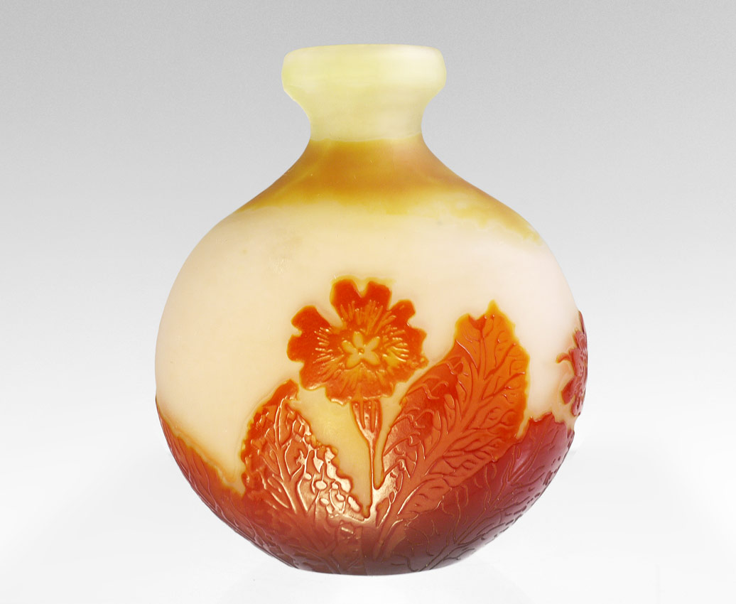 CAMEO GLASS VASE SIGNED GALLE: Cameo cut in a floral design, Emile Galle Nancy Paris paper label, 5'' x 4 1/2''.
