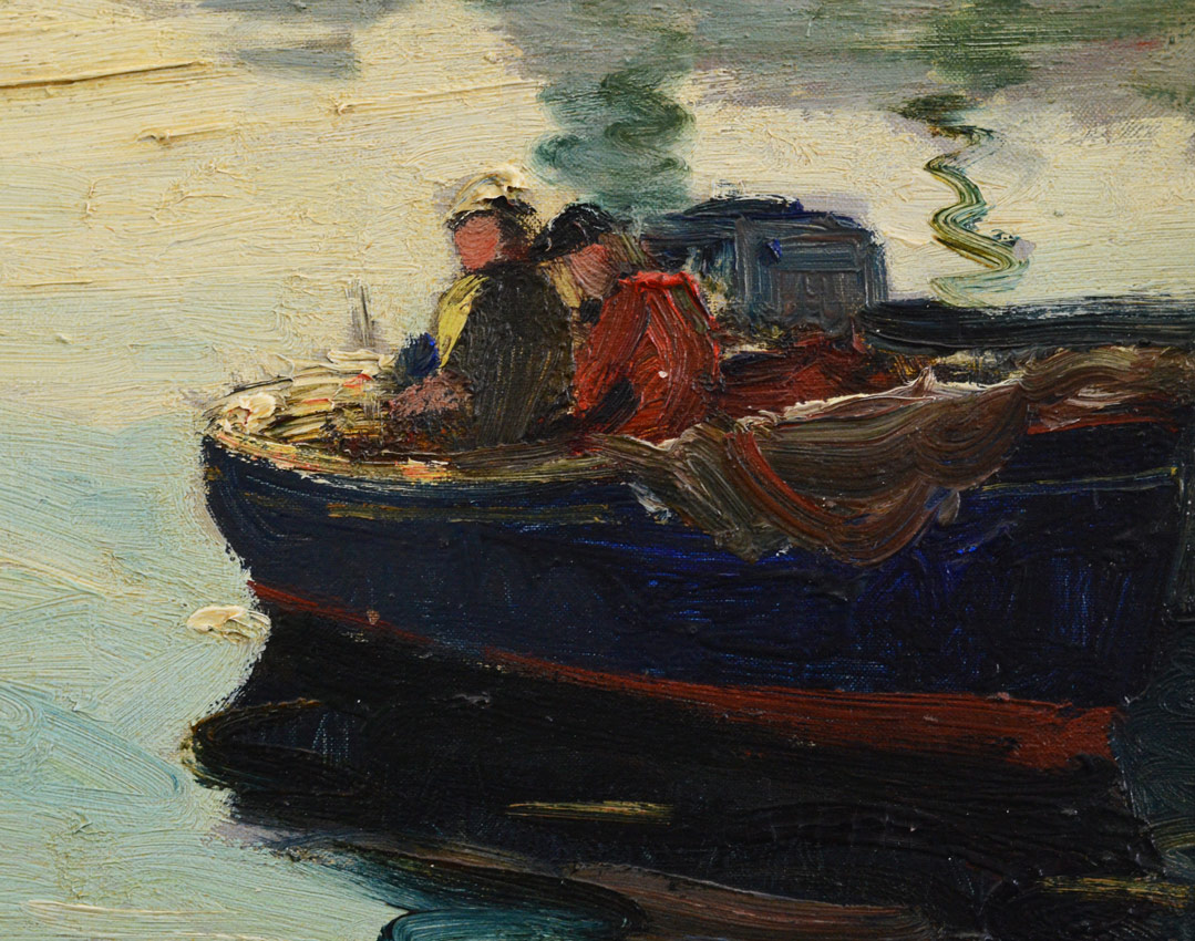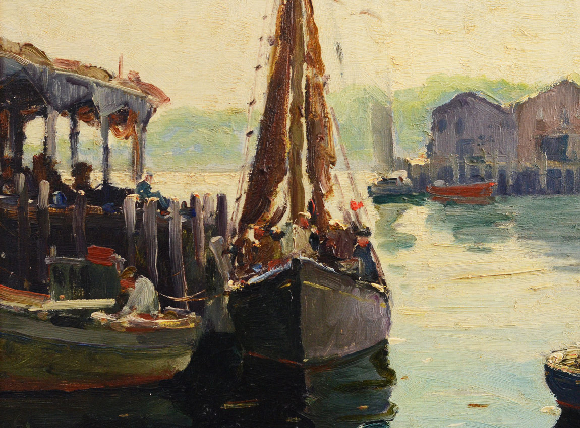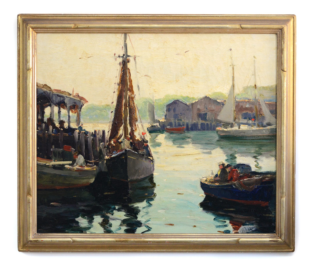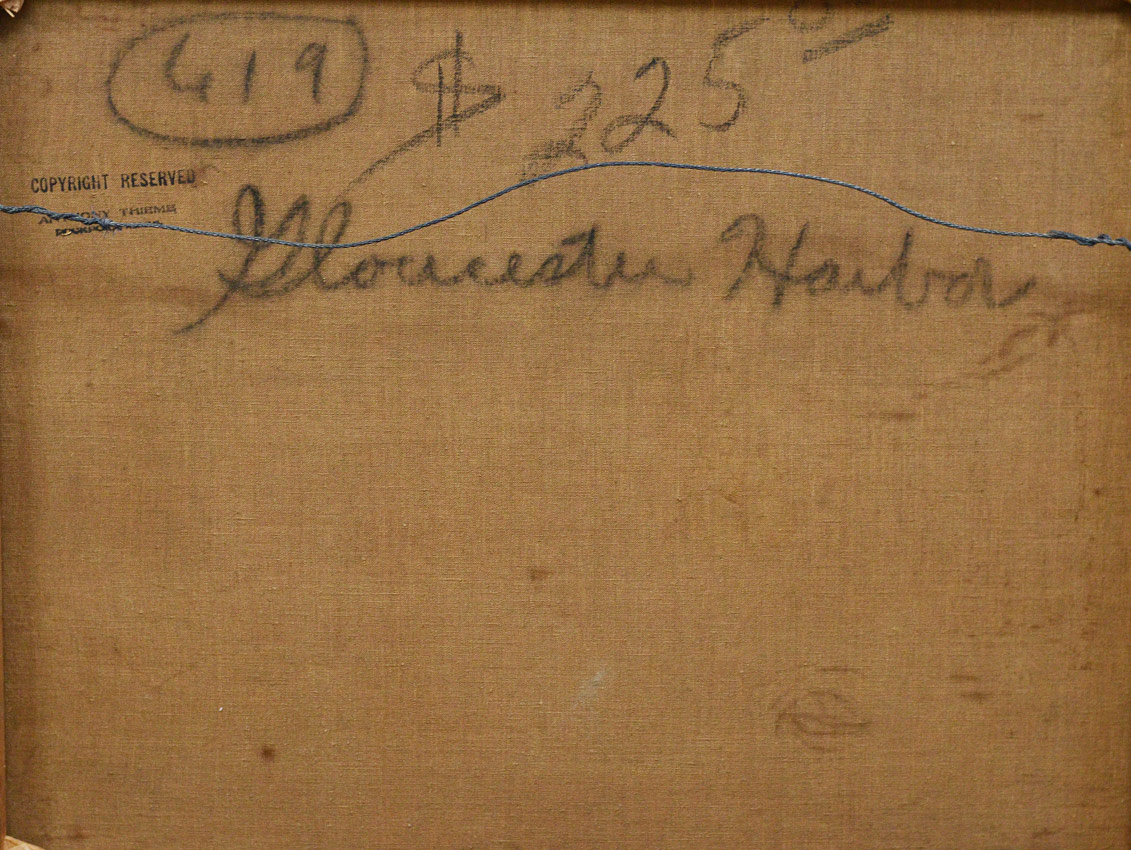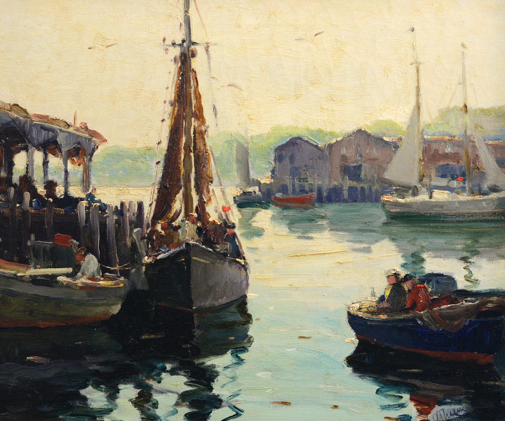 THIEME, Anthony, (American, 1888-1954): ''Gloucester Harbor'', Oil/Canvas, 20'' x 24'', signed lower right, titled verso with original price, Thieme copyright reserve stamp to the canvas, original carved and gilded frame with as expected wear, 23 1/2'' x 27 1/2''. This is a ''fresh to the market'' painting which may require some cleaning, it does have very heavy impasto. Purchased in 1999 from Gertrude Lank, a retiree in Florida, formerly of Rockport, Mass. She purchased the painting from the artist directly for ''over $200'' many years ago.