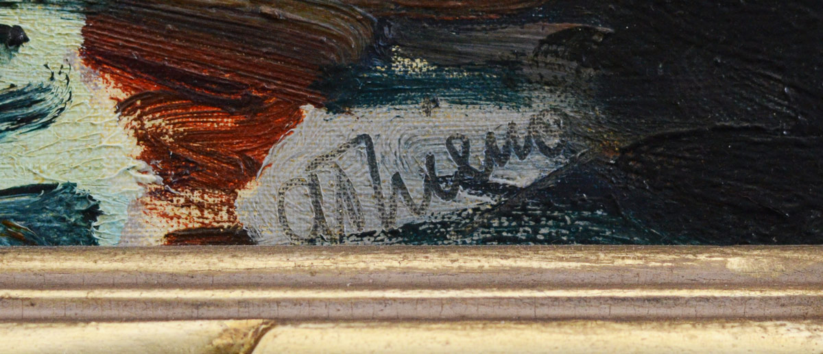 CONDITION: Very minor stretcher bar wear in upper margin and minor craquelure, several very minor flecks of paint loss in lower right corner.