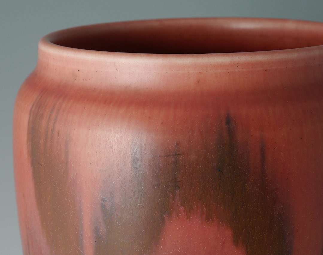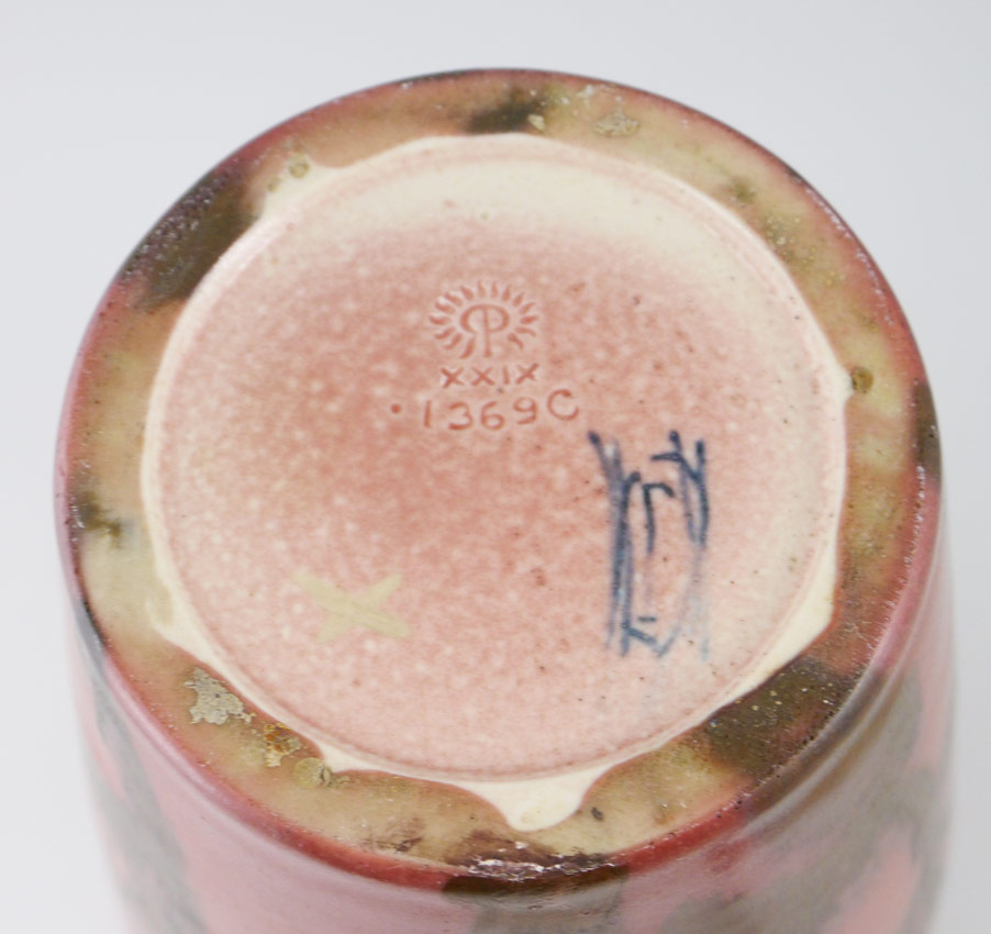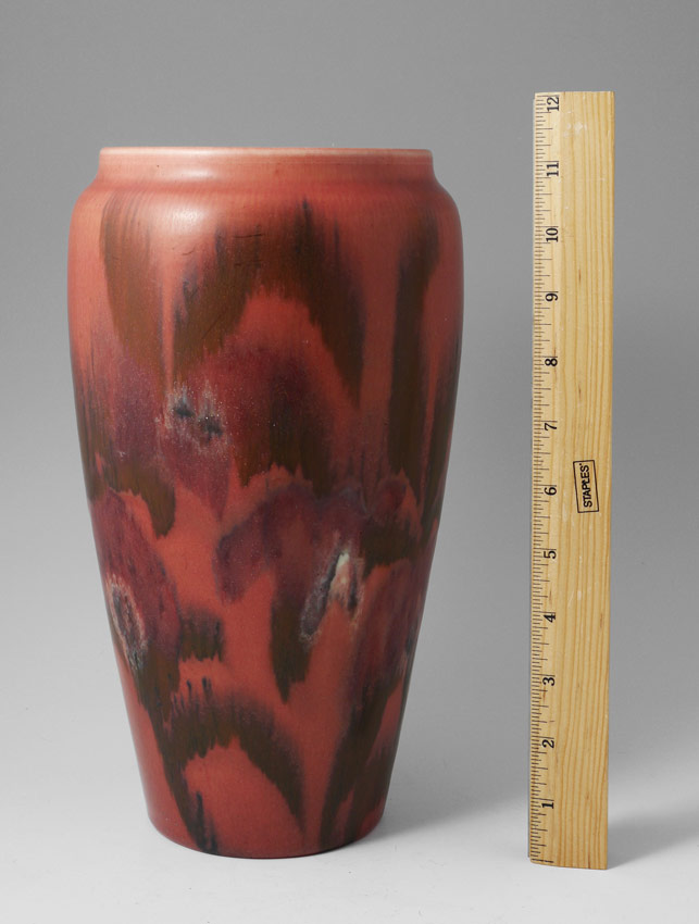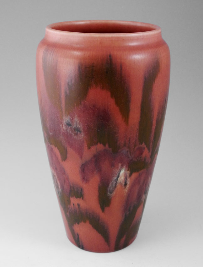 1929 JENS JENSEN ROOKWOOD FLORAL VASE: Stylized floral motif, matte glaze. Form 1369C, dated 1929, signed on base. 11 1/4'' h. x 6 1/4''.