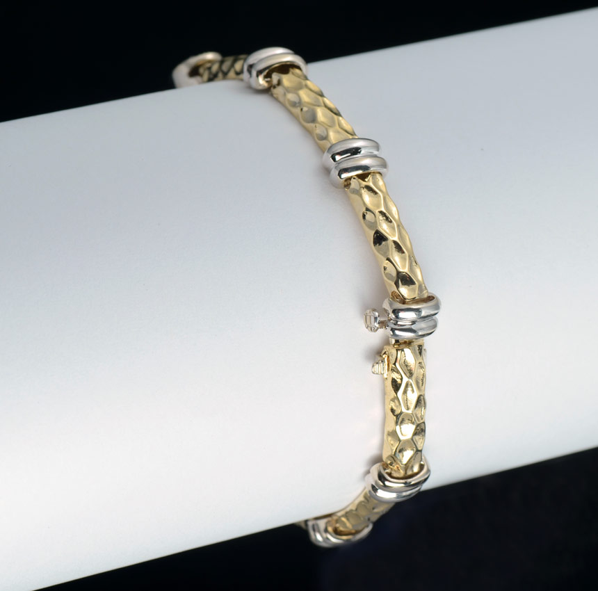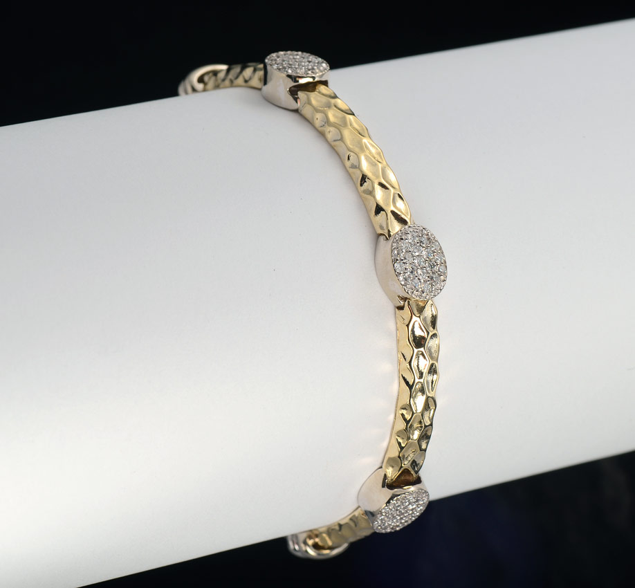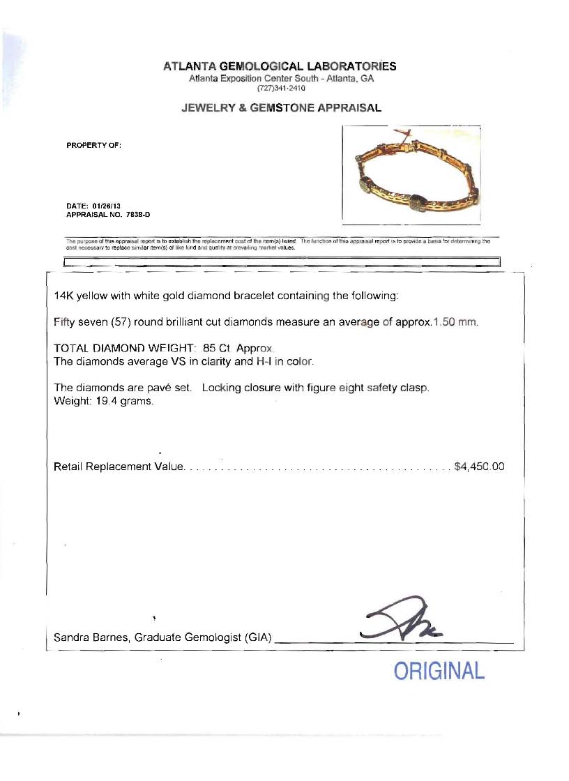 TWO TONE GOLD DIAMOND BRACELET: 14K yellow and white gold segmented bracelet with three oval pave diamond filled links. 57 round brilliant diamonds total approx. .85 Ct., VS clarity and H-I color. Locking closure with figure eight safety clasp. Length: 7''. Weight; 19.4 grams. Sold with current Atlanta Gemological GIA graduates appraisal for $4450.
