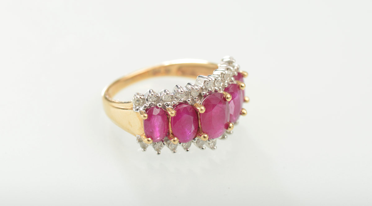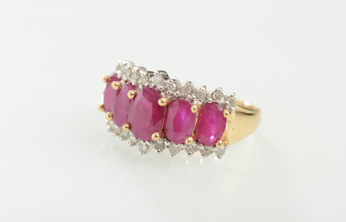 RUBY & DIAMOND RING: 14K yellow gold ring contains 5 oval mixed cut rubies totaling approx. 3.00 Ct. 22 round single cut diamonds. Weight: .10 Ct. Approx. Rated SI in clarity and I-J in color. The rubies and diamonds are prong set. Weight: 4.6 grams. Size: 7