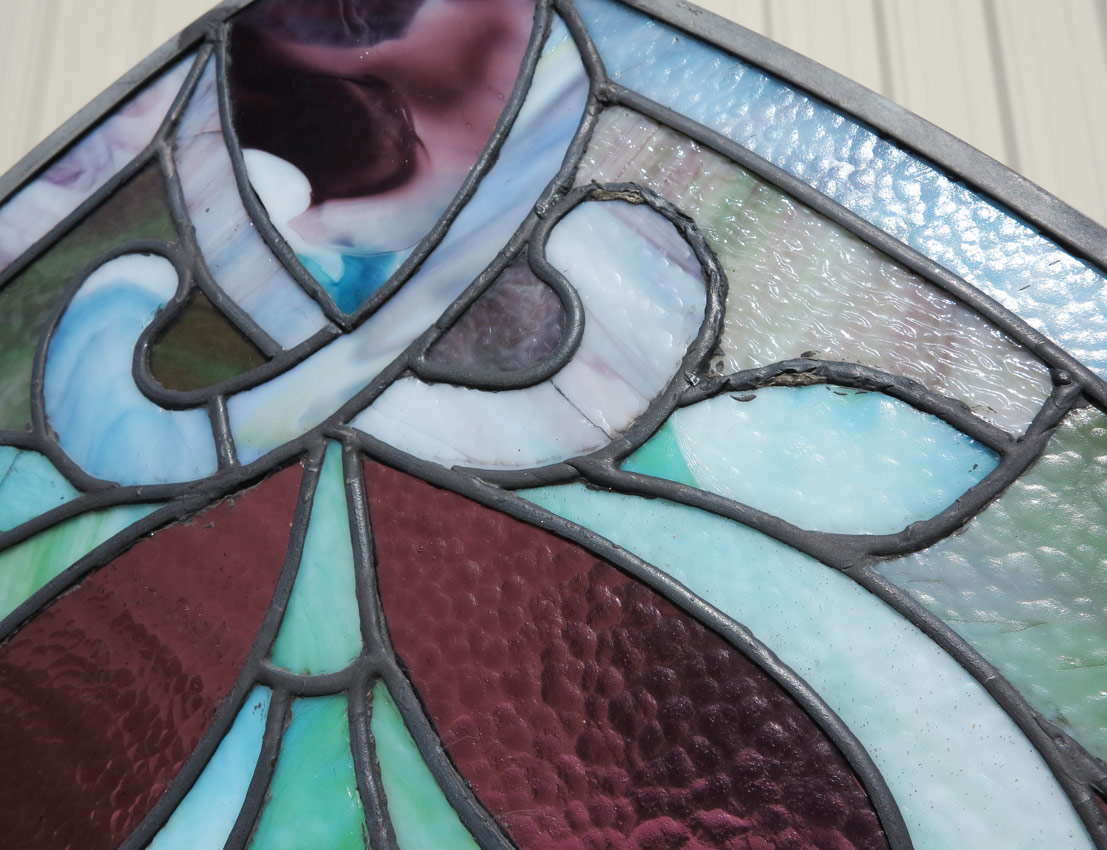 LARGE ARCHED TOP STAINED GLASS WINDOW: With a myriad of glass styles and colors. Measures 54 1/4'' x 36 1/2''.