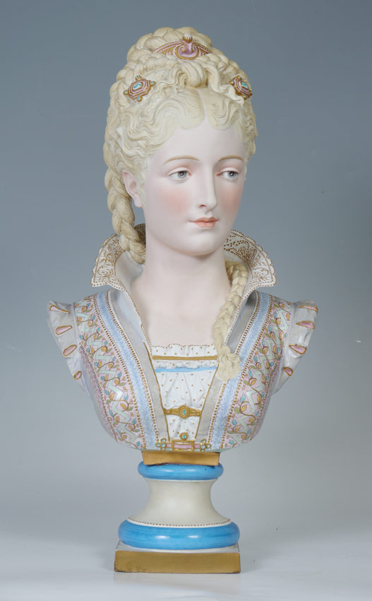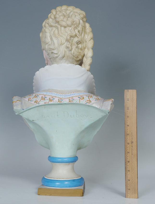 PAUL DUBOY BISQUE BUST OF A WOMAN: Hand painted bisque bust of a regal woman, incised Paul Duboy, 22 3/4'' h. x 12'' x 7''.