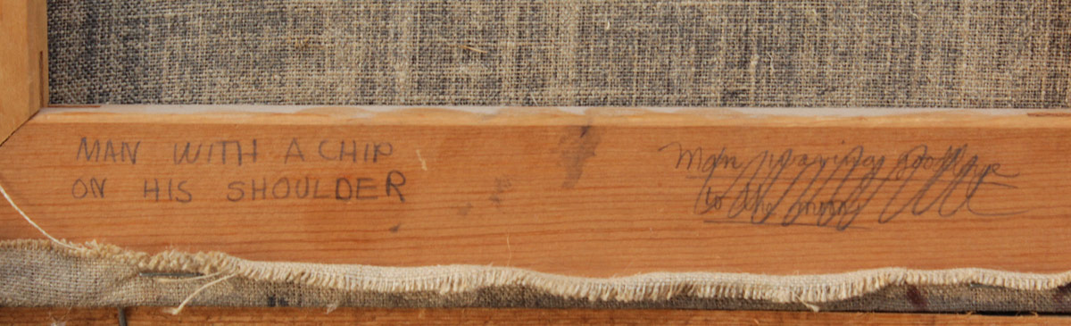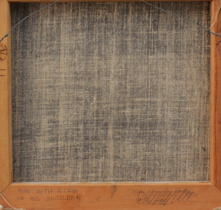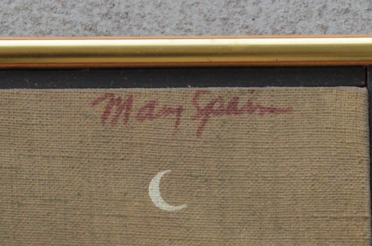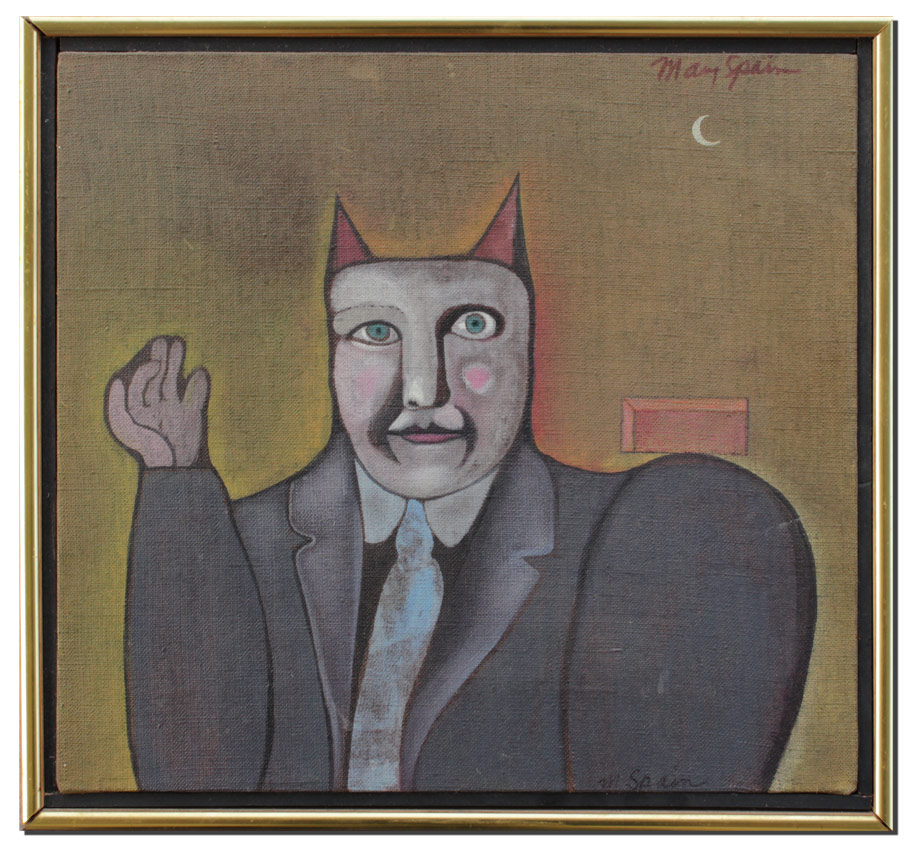 SPAIN, Mary, (American, 1934-1983): ''Man with a Chip on his Shoulder (Man Waiving Goodbye to the Moon)'', Oil/Canvas, 11'' x 12'', signed lower right and upper right, titled on the stretcher twice verso, framed 12 1/4'' x 13 1/4''.