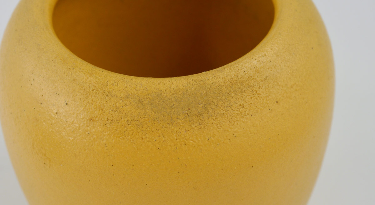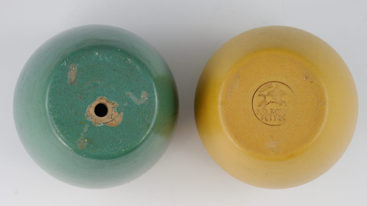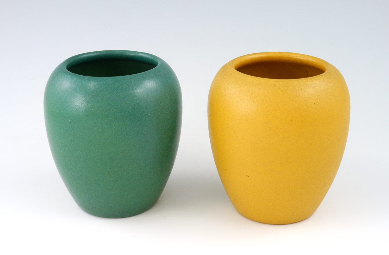 2 PIECE PAUL REVERE POTTERY VASES: Each impressed with Paul Revere Pottery mark at base. One mustard yellow, the other blue/green with matte glaze. 4 1/4'' h. x 3 3/4'' dia..