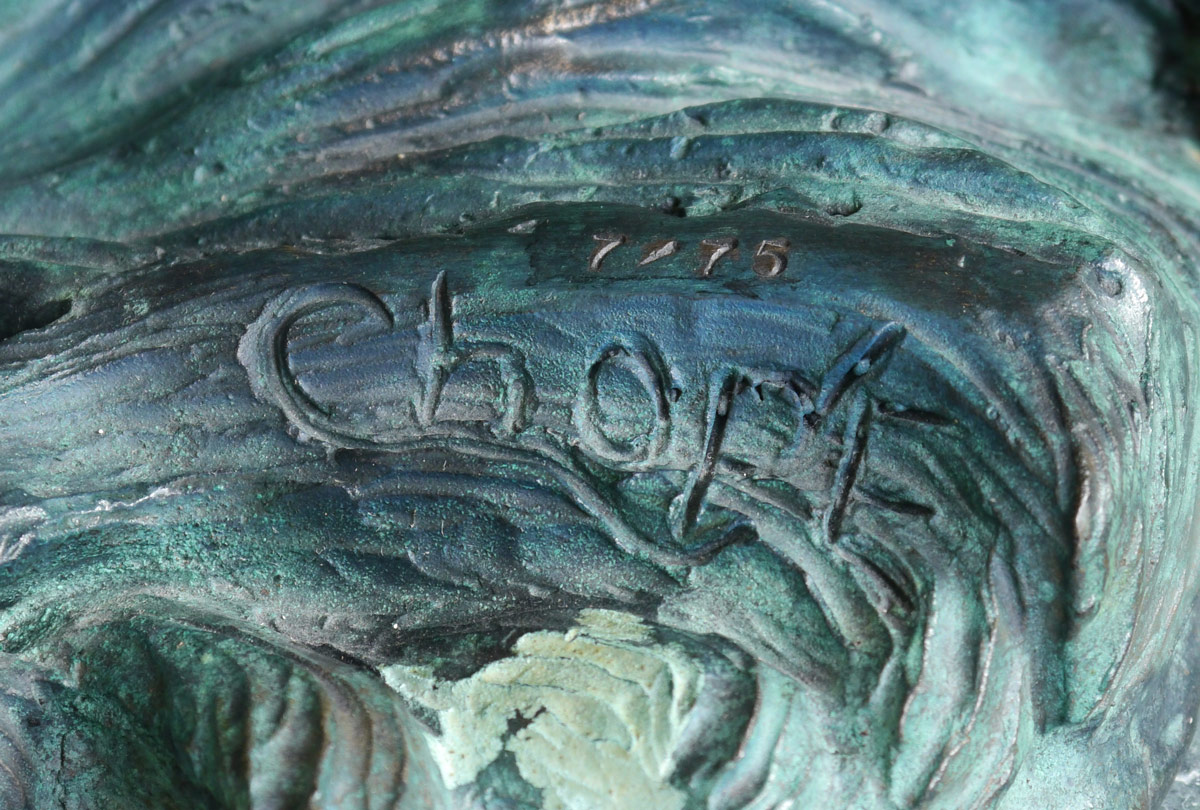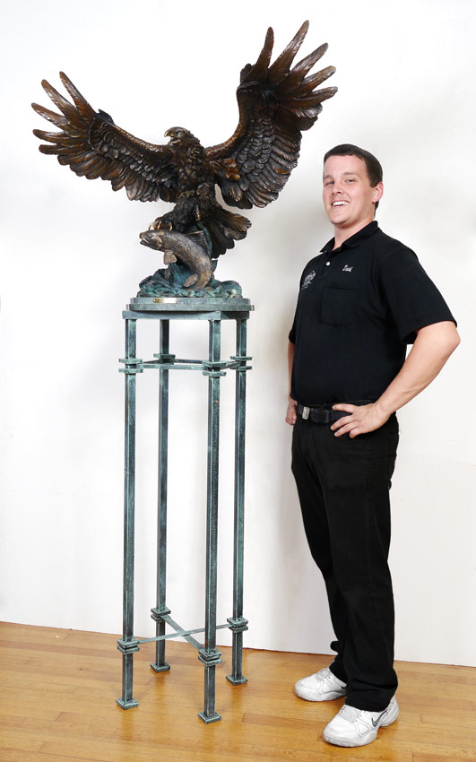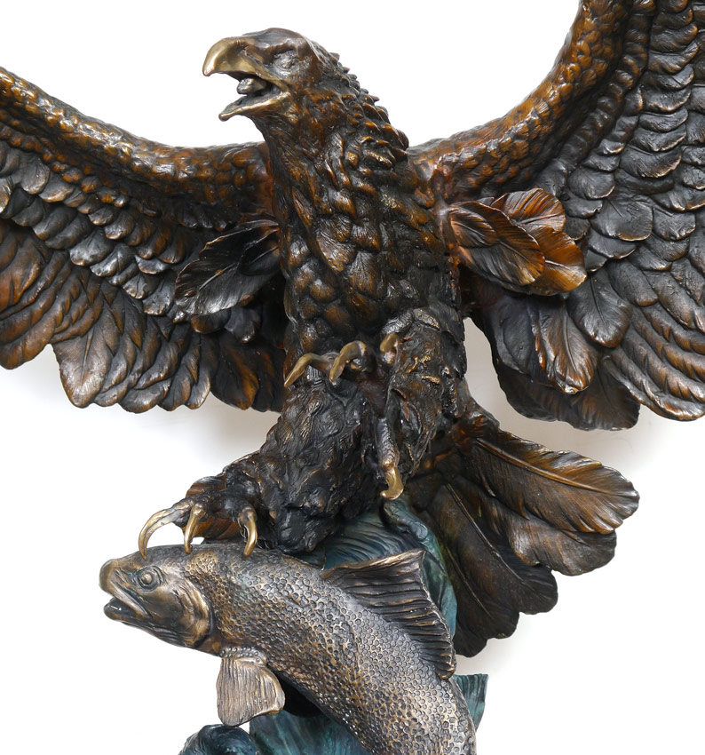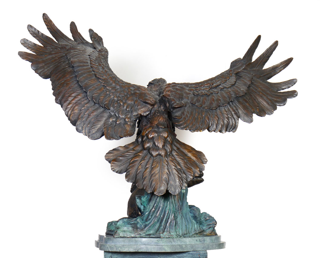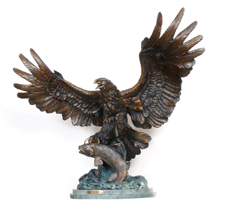 CHOPE, Edward, (American, 20th Century): Eagle catching a salmon titled ''The Fisherman'', Bronze, signed, 7/75, affixed to two tier marble base. 31 1/2'' h. x 37'' x 15 1/2''. Sold with COA and contemporary metal pedestal.