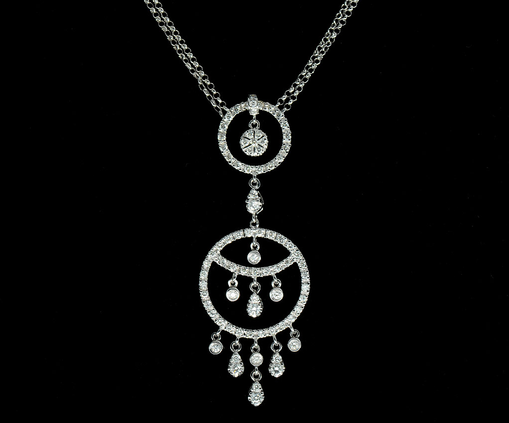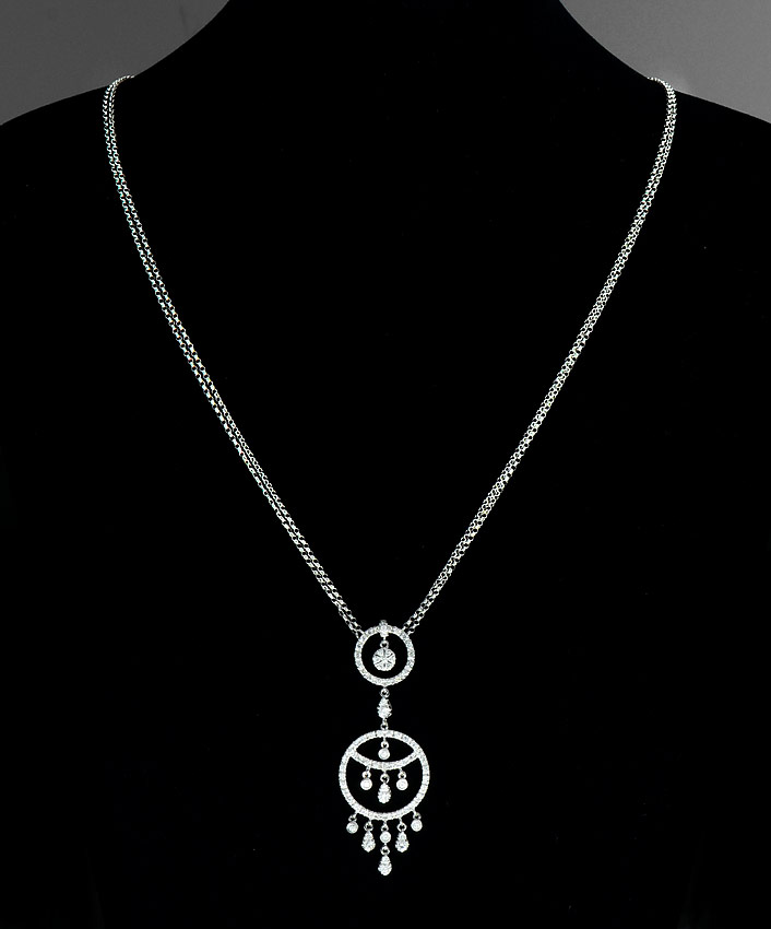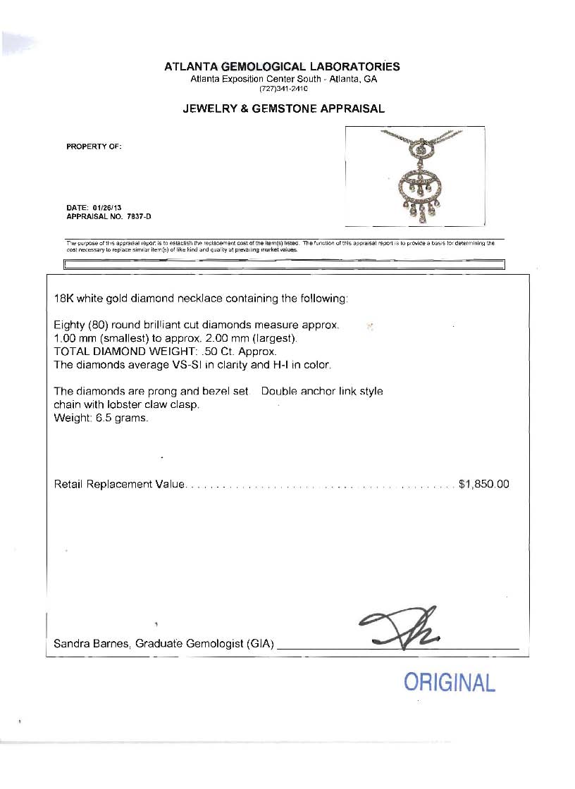 18K WHITE GOLD DIAMOND LAVALIER NECKLACE: Modern design pendant of 80 round brilliant diamonds totaling approx. .50 Ct., averaging VS-SI in clarity and H-I color. Integrated double anchor link chain Weight 6.5 grams. Sold with current Atlanta Gemological GIA graduates appraisal for $1850.