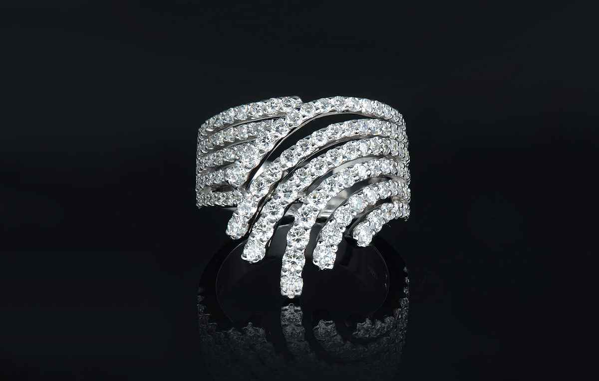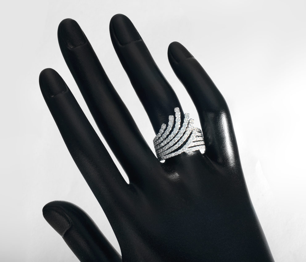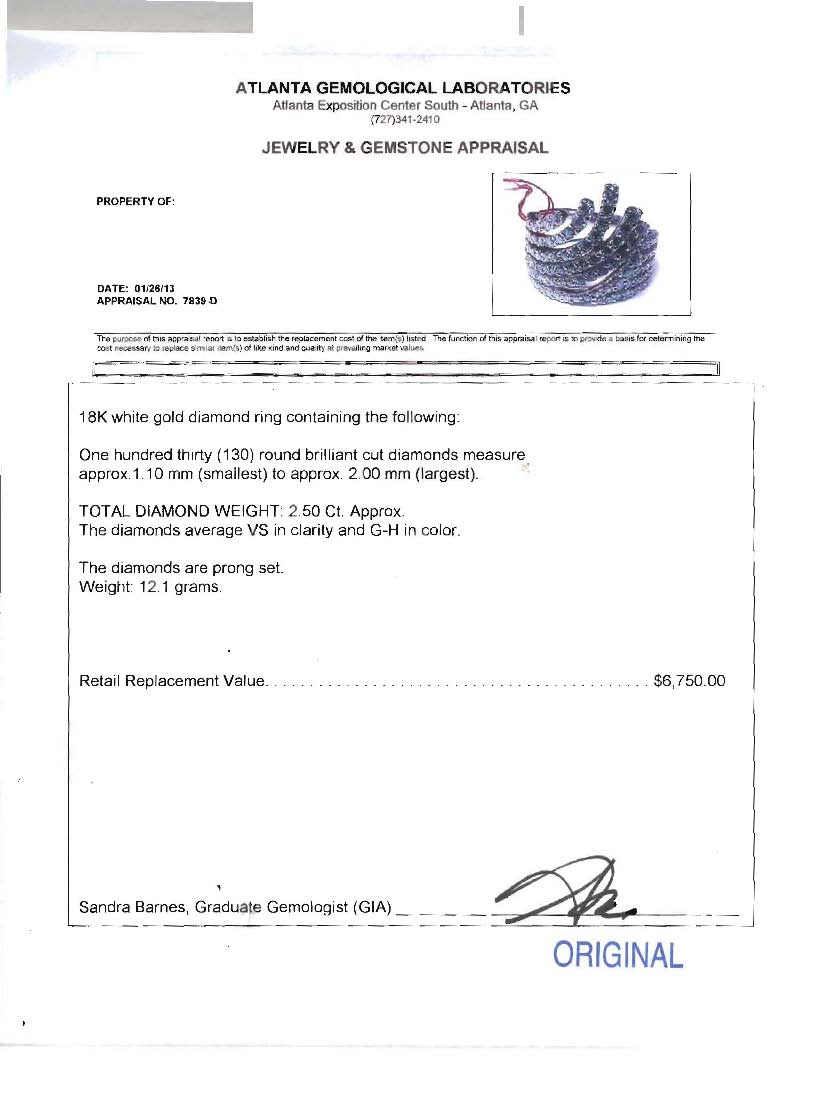 18 KT GOLD & DIAMOND COCKTAIL RING: 18K white gold ring set with 139 round brilliant diamonds totaling approx. 2.50 Ct., averaging VS in clarity and G-H color. Size 7. Weight 12.1 grams. Sold with current Atlanta Gemological GIA graduates appraisal for $6750.