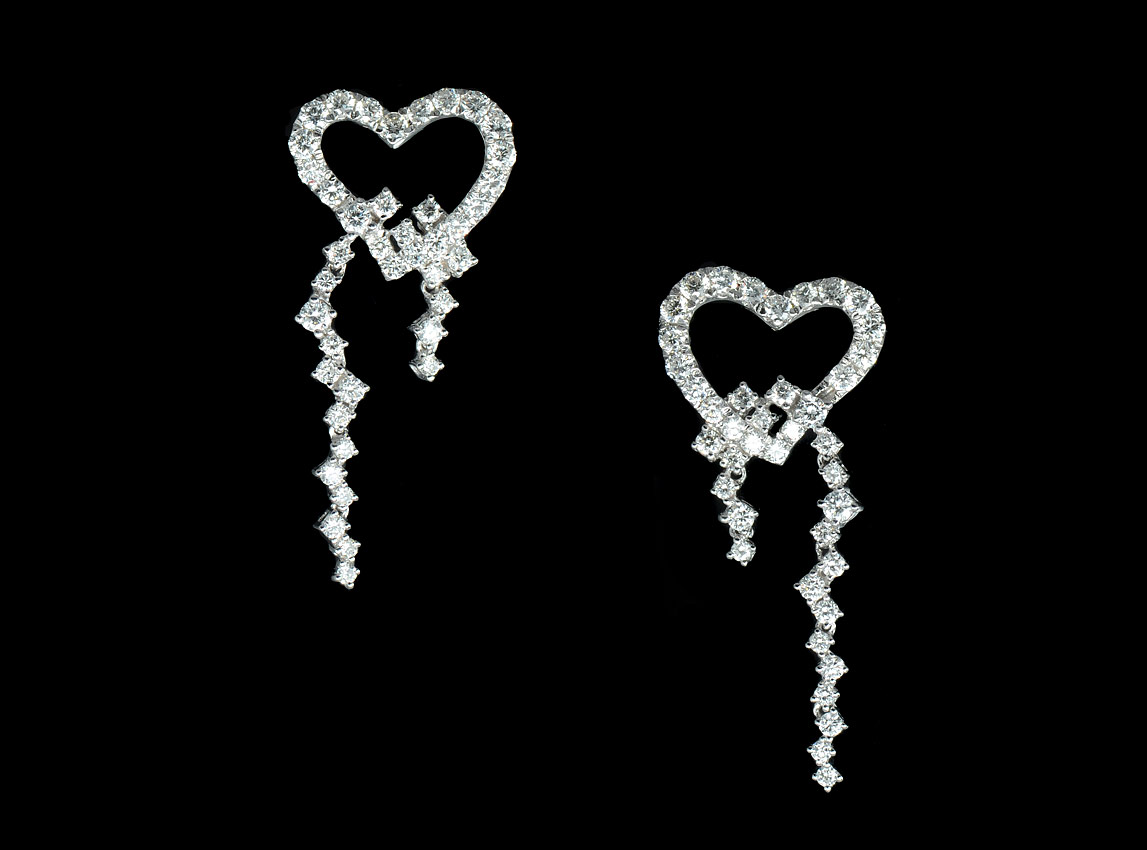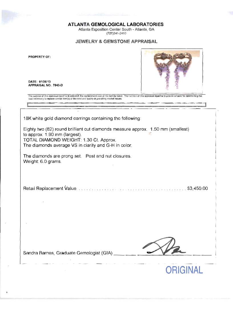 18K WHITE GOLD DIAMOND EARRINGS: Stylized hearts of 82 round brilliant earrings totaling approx. 1.30 Ct., averaging VS in clarity and G-H color. Prong set. Post and nut closures. Length 1.25''. Weight 6 grams. Sold with current Atlanta Gemological GIA graduates appraisal for $3,450.