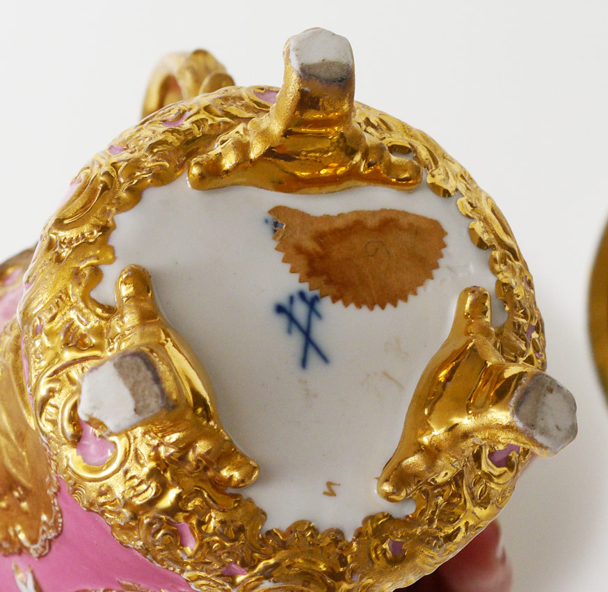 MEISSEN WASHINGTON & FRANKLIN CUP PLUS ANOTHER: 4 pieces total to include 1-2) Parcel gilt portraits in profile of George Washington and Benjamin Franklin with American eagle and motto. Pink ground, on 3 feet. Cup 5 1/4'' h. x 5 1/2'', saucer 7'' dia. 3-4) Portrait of unknown royal couple with crest. Blue ground, on 3 paw feet. Cup 5 1/4'' x 4 3/8'', saucer 7''.