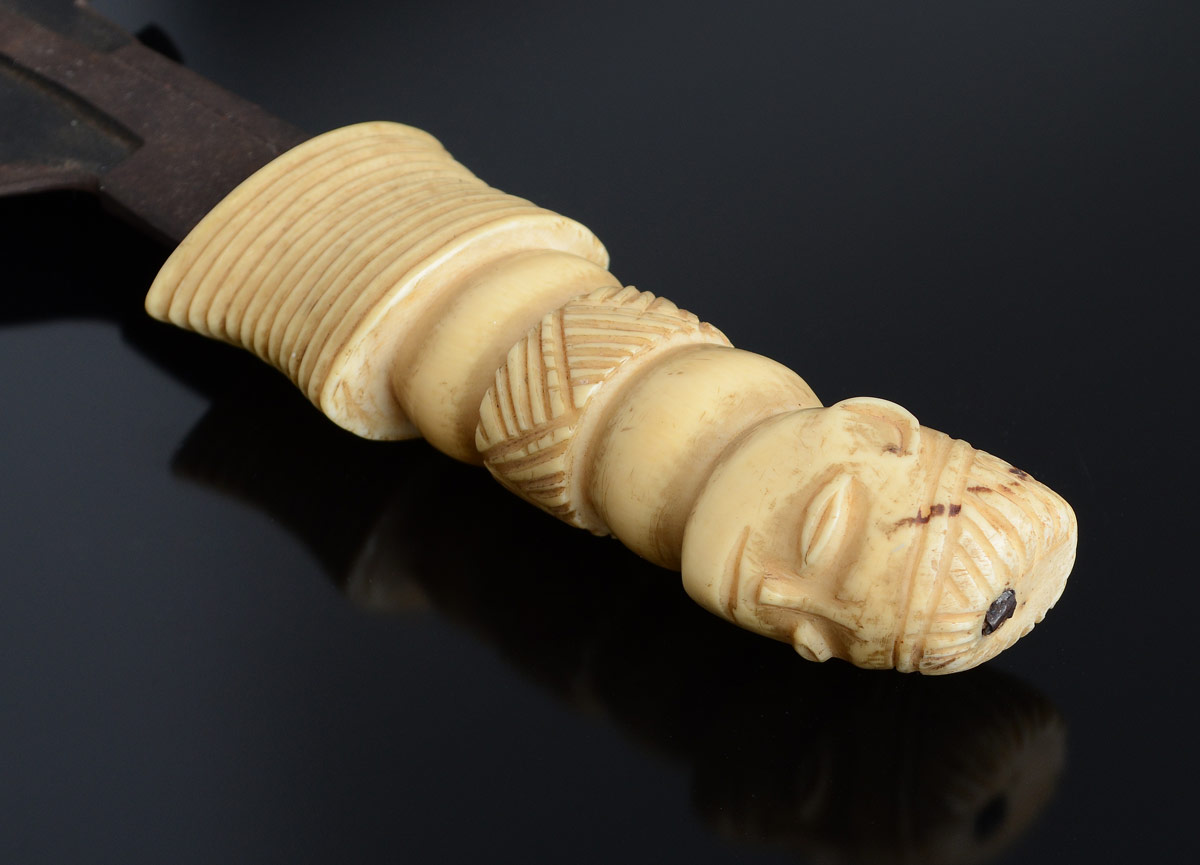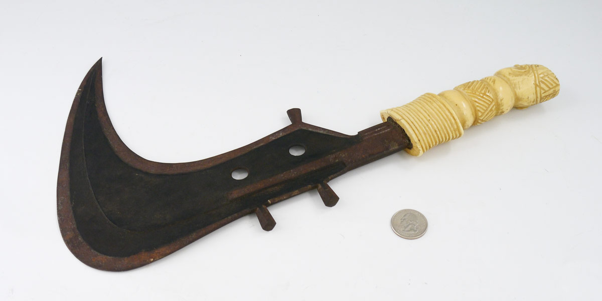 MANGBETU AFRICAN SICKLE KNIFE: Figural carved ivory handle, 14 3/8'' l. x 8 3/8''.