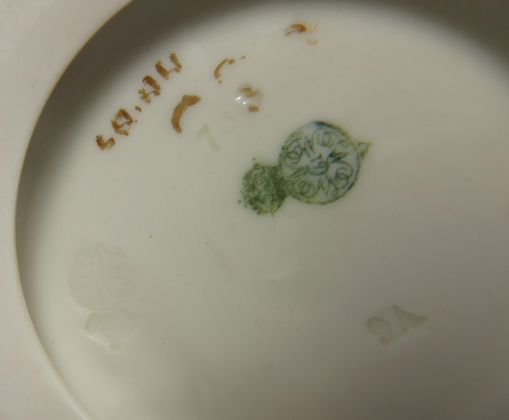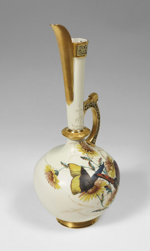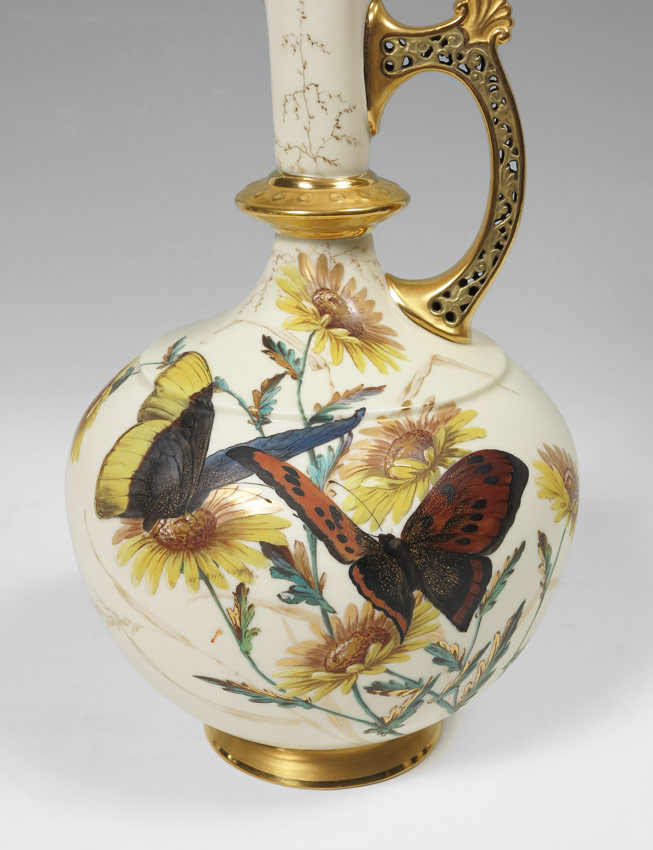 ROYAL WORCESTER HAND PAINTED EWER: Butterflies and daisies. Reticulated handle and rim. The date mark indicates Ca. 1884. Measures 17 1/2'' tall.