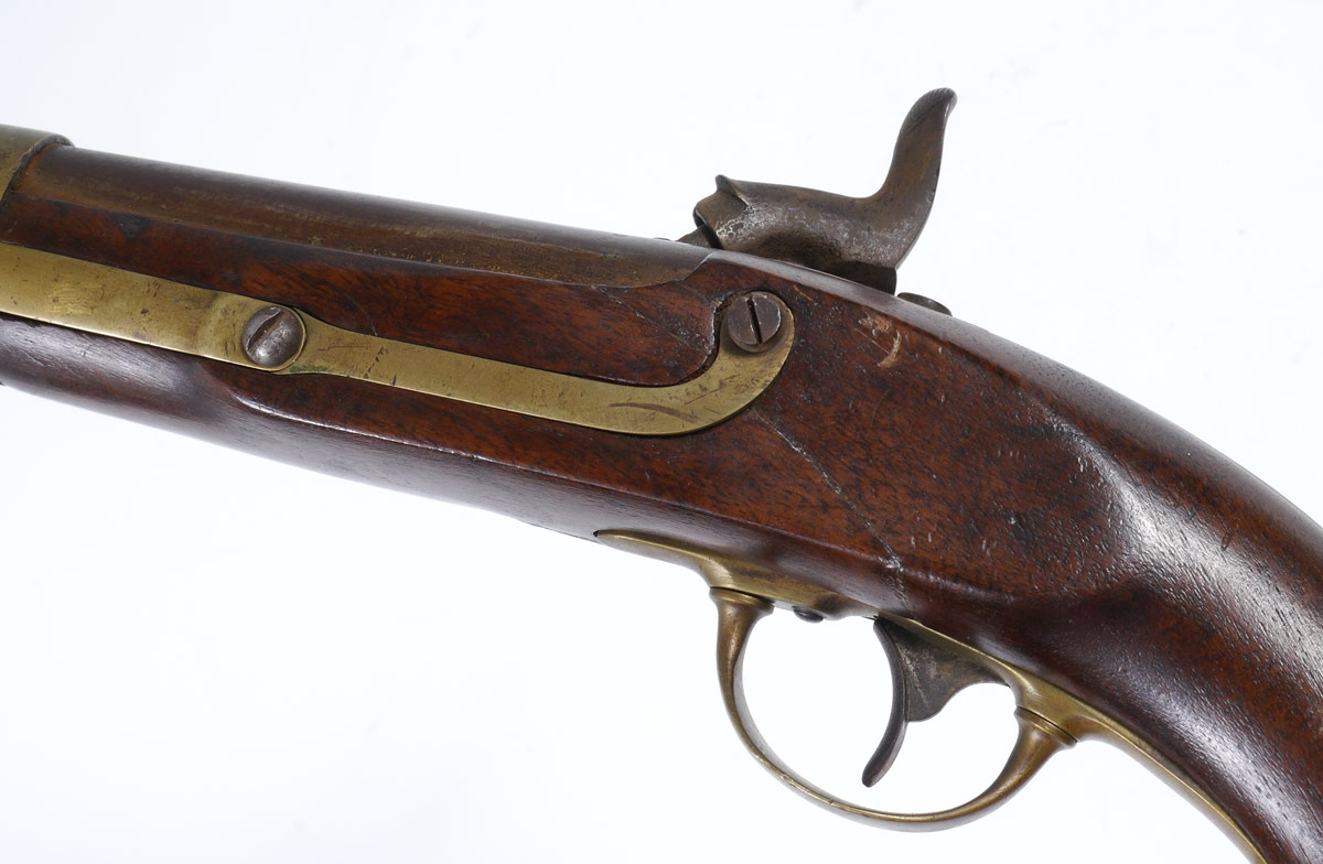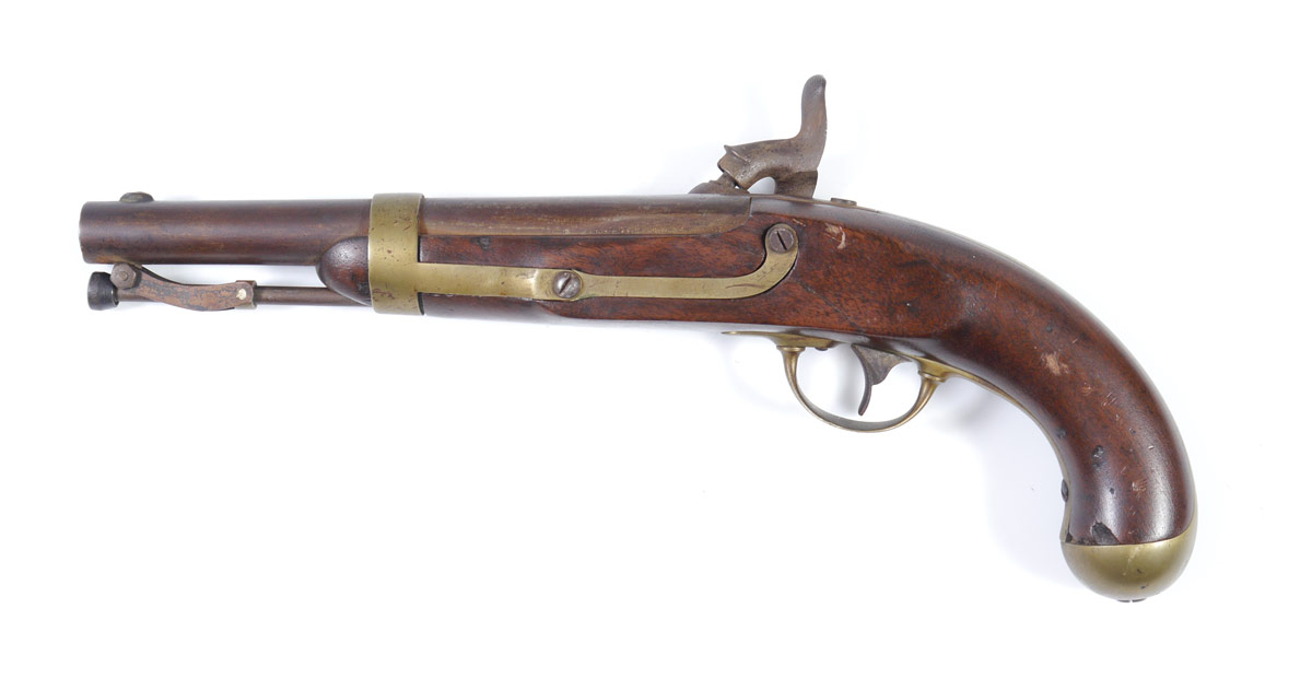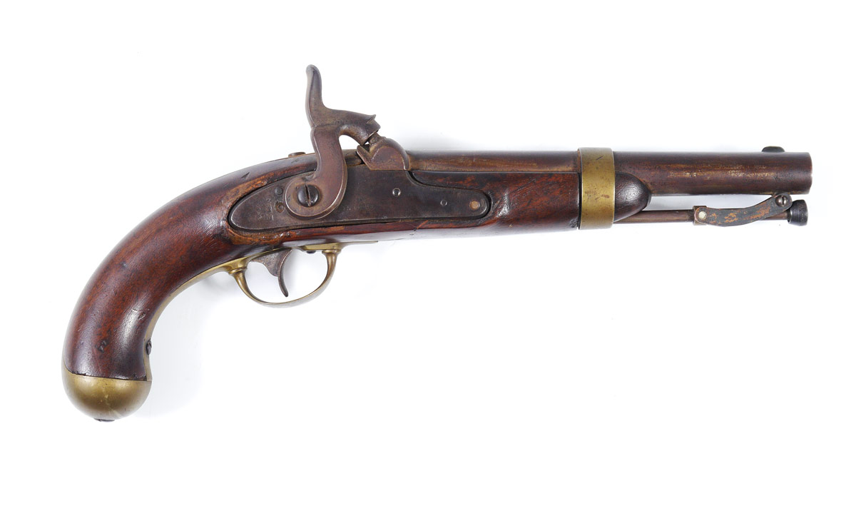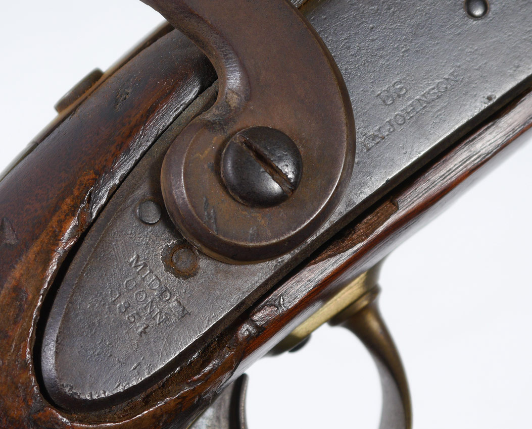 I.N. JOHNSON MODEL 1842 PERCUSSION PISTOL: Marked on lockplate I. N. Johnson, MiddTN, Conn, and dated 1854. Original brass furniture, walnut stock. 8 1/2'' smoothbore barrel. Action currently works, trigger loose. Overall 14 1/2'' l.