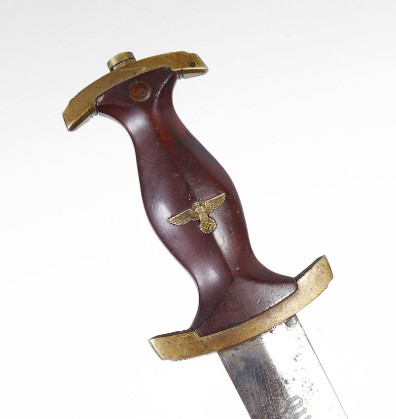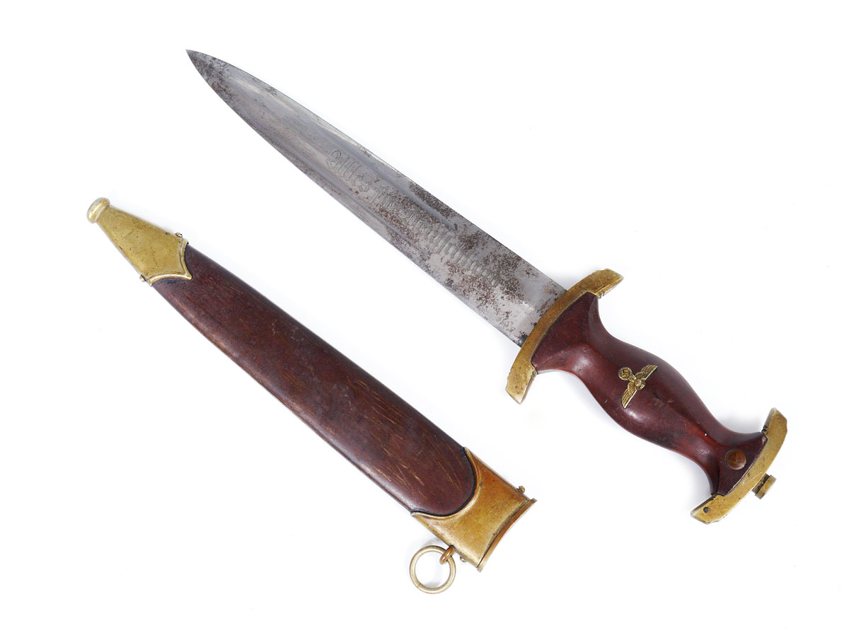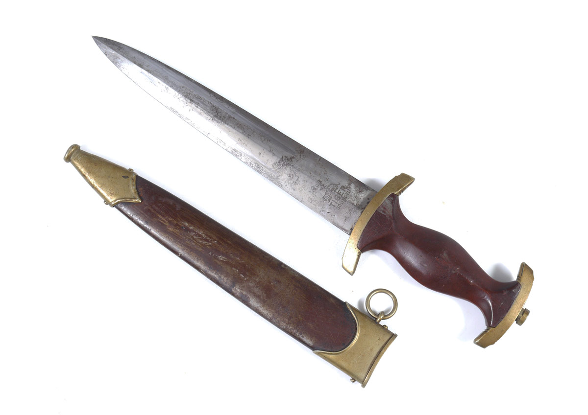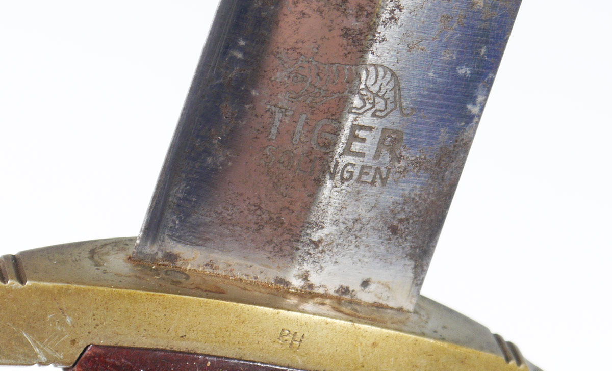 TIGER GERMAN WWII SA DAGGER: Brass pommel, emblem and knuckleguard. 8 5/8'' blade marked Tiger Solingen and motto. Metal scabbard with brass mounts. 14 5/8'' long overall.