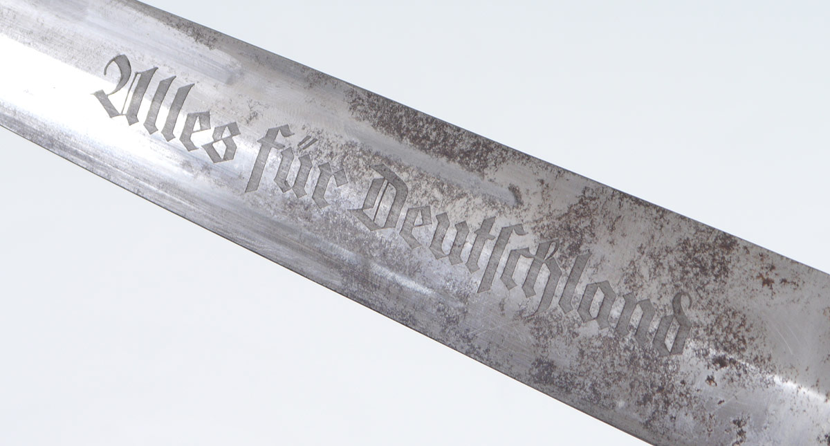 CONDITION: Age staining to blade, uneven patina to metal on scabbard.