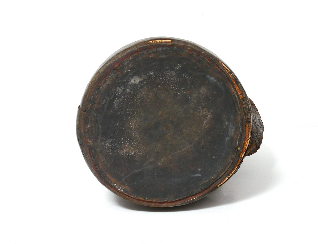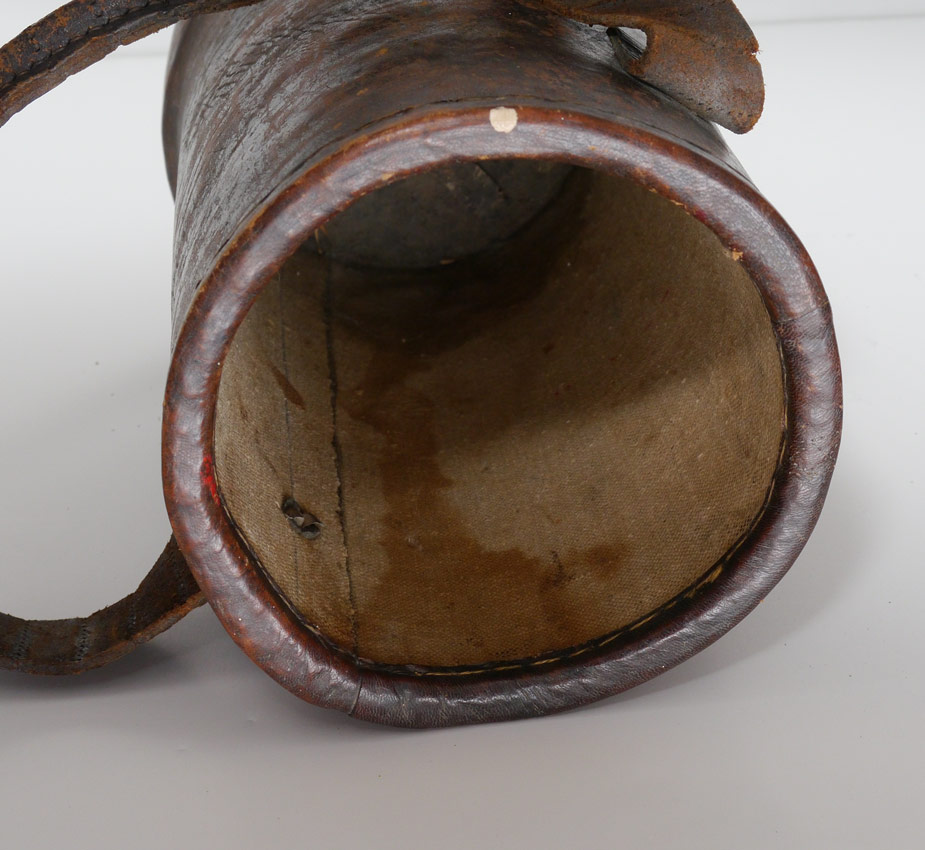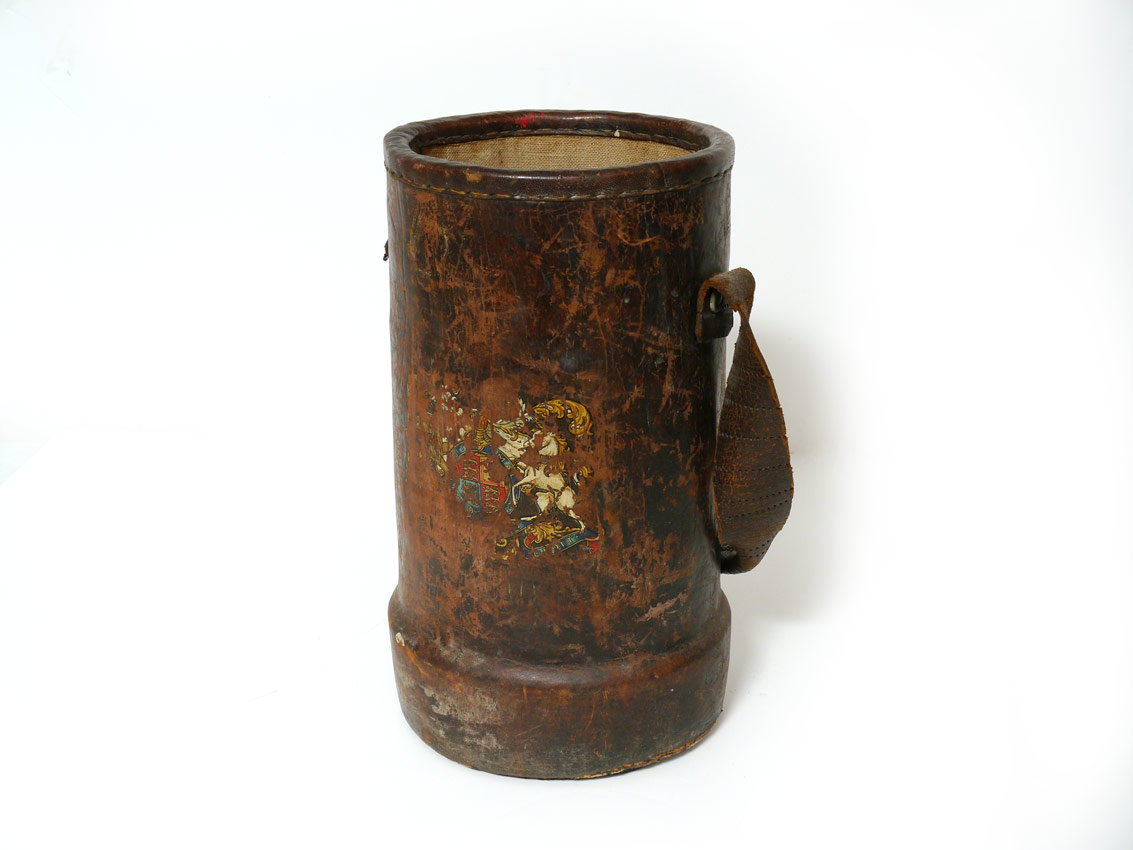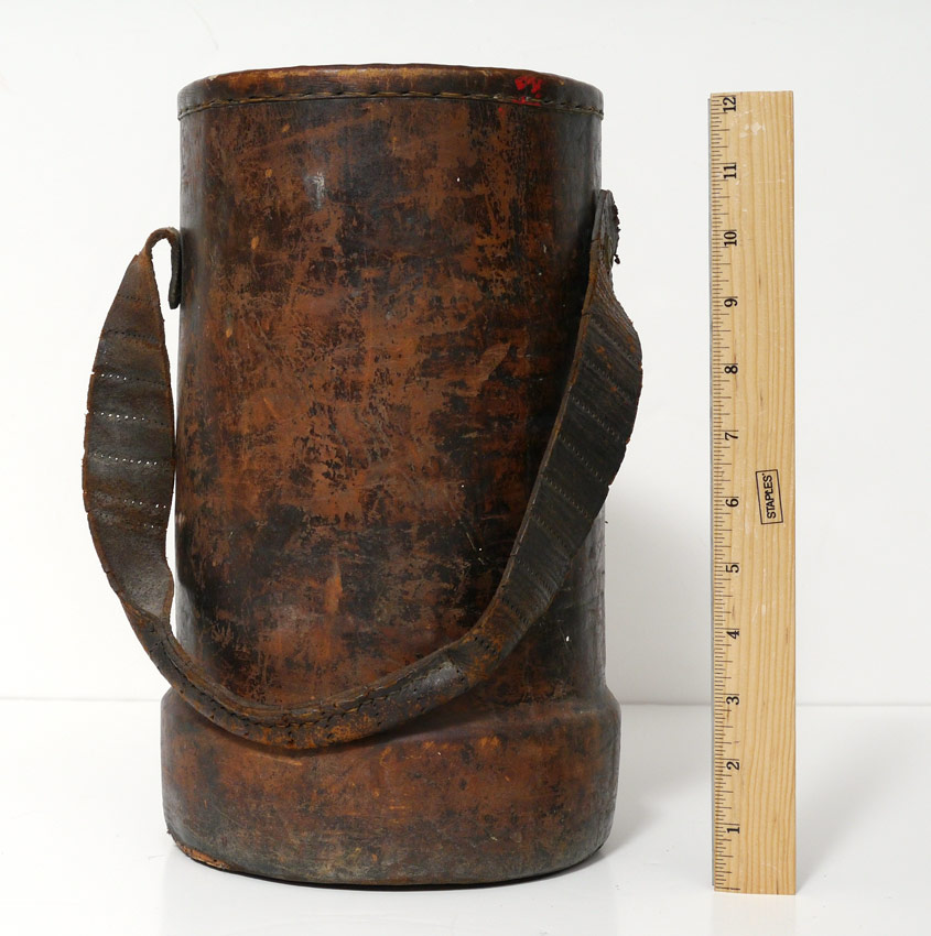 19TH CENTURY BRITISH ROYAL NAVY CANNONBALL BUCKET: Leather bucket with partial Royal Navy emblem remaining. Original leather strap. Missing metal insert. 12 1/2'' h. x 7 1/2''.