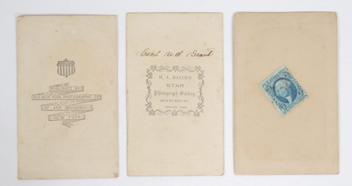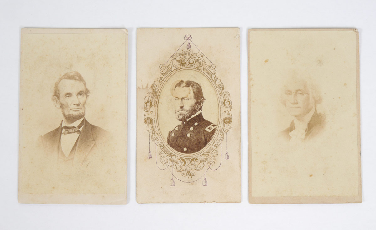 3 CDV COLLECTION LINCOLN, GRANT, & WASHINGTON: Collection of 3 CDV's to include 1) Abraham Lincoln, published by The New York Photographic Co., New York. 2) Ulysses S. Grant, published H. A. Balch's Star Photography Gallery, Memphis, Tenn. 3) General George Washington, unmarked. Carte de visite or visiting card photographs are referred to as a CDV.