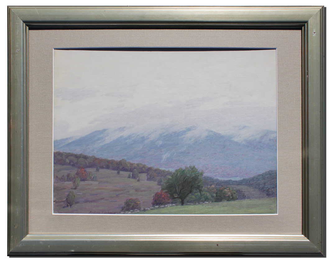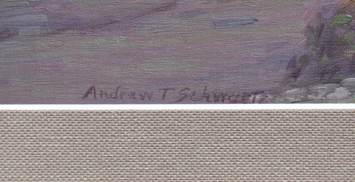 SCHWARTZ, Andrew Thomas, (American, 1867-1942): Mountain Valley Landscape, Oil/Canvas board, Sight size 14'' x 19'', signed lower left, contemporary silver gilt frame with some wear, 21 1/4'' x 27 1/2''.