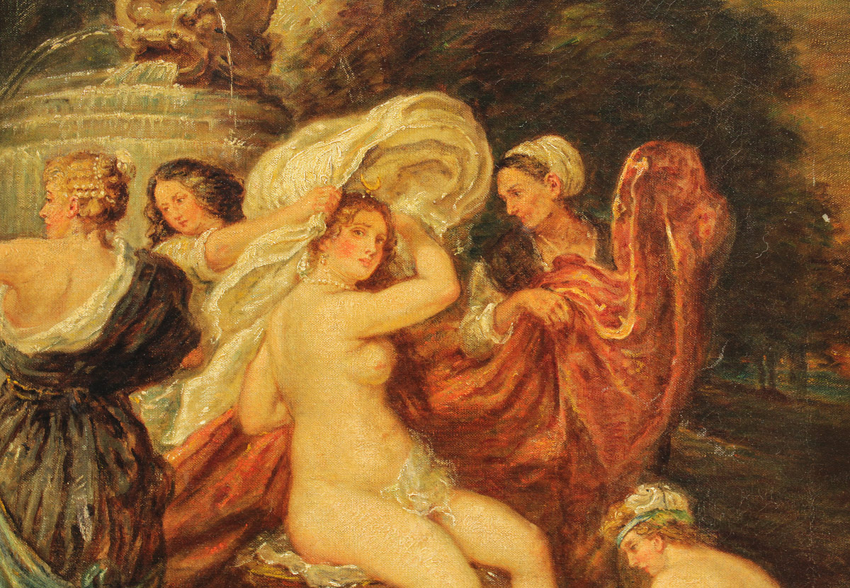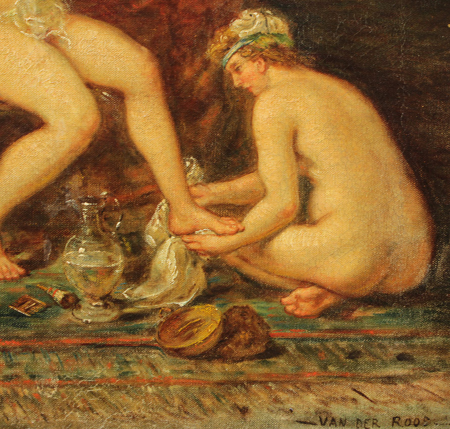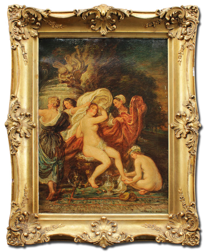EARLY MASTER STYLE PAINTING OF A FEMALE NUDE WITH ATTENDANTS: Oil/Canvas, circa 1900, 24'' x 18 1/4'', signed lower right Van der Ruse, encased in a pierced carved and gilded frame with wear and repair, 31 1/2'' x 25 1/2''.