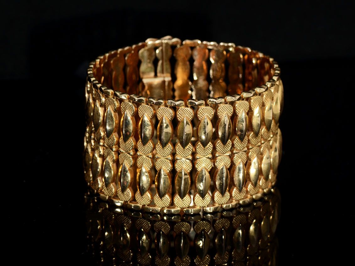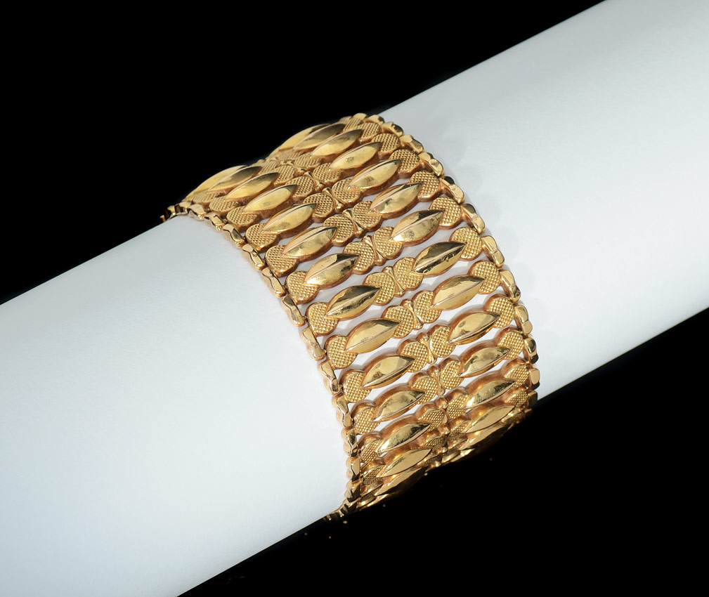 EXTRA WIDE ITALIAN 18K GOLD BRACELET: 14K yellow gold wide fancy link bracelet. Length: 7.75''. Width: 1.5''. Weight: Approx. 55.3 grams. Ca. 1940's.