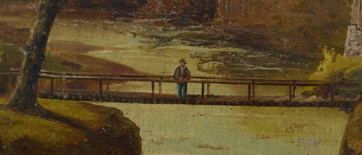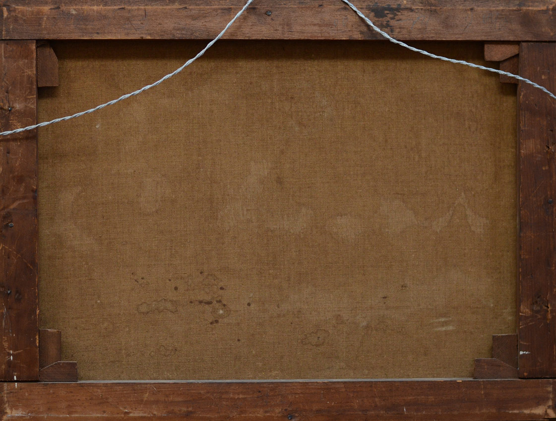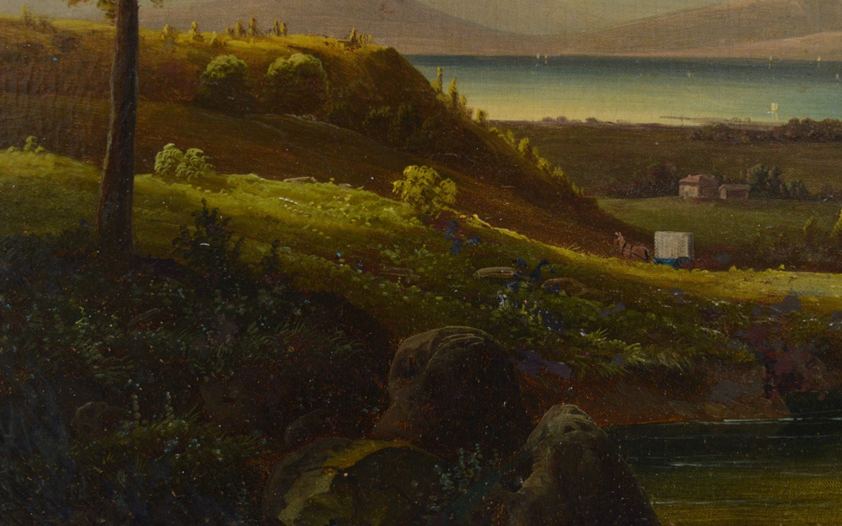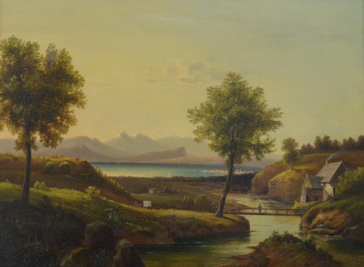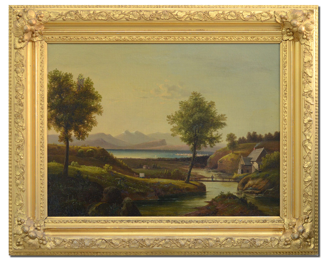 EXCEPTIONAL 19TH CENTURY EUROPEAN LAKEVIEW: Oil/Canvas, Depicts a Stream Leading to a Village with City and Snowcapped Mountains in the Distance, no visible signature, illegibly markings to the stretcher verso, 18 1/4'' x 24'', encased in a heavy quality, re-gilded frame with wear, 24 1/2'' x 31 1/2''.