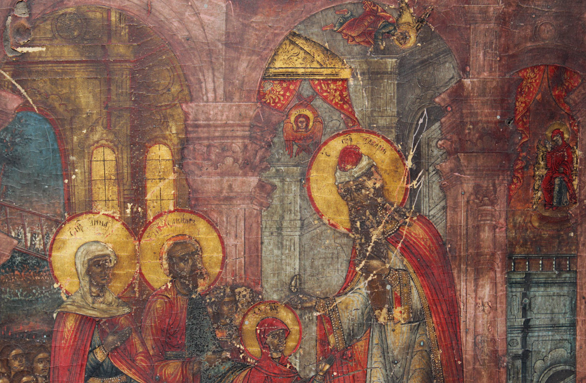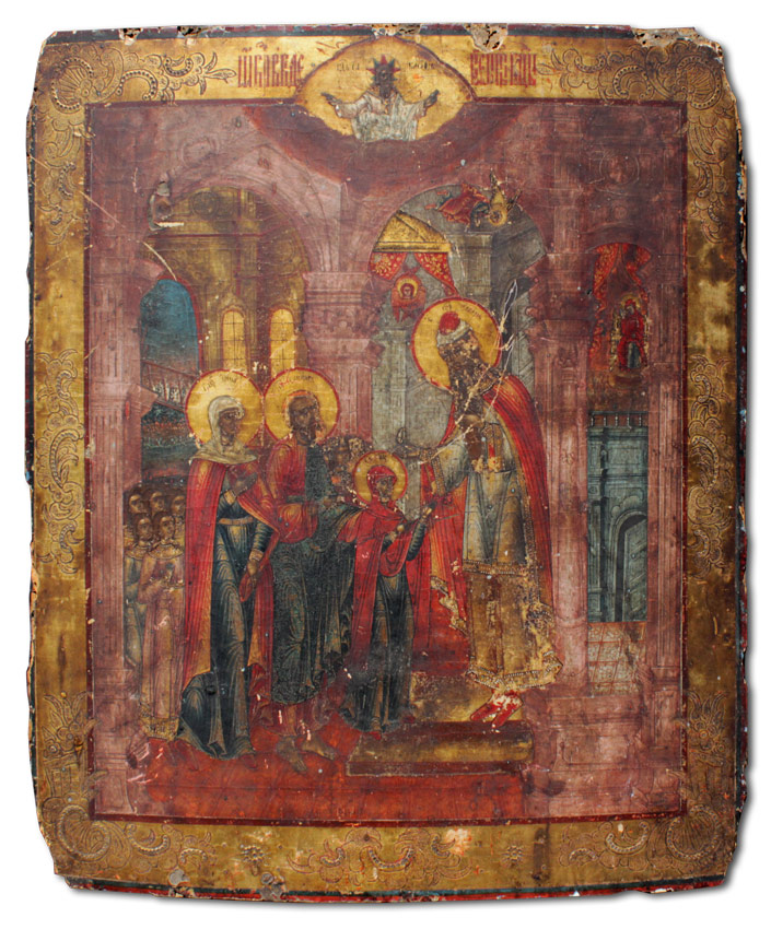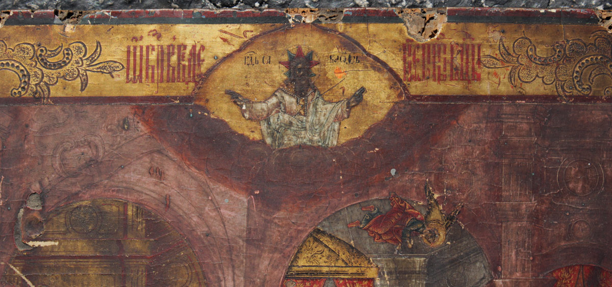 IMPORTANT EARLY RUSSIAN ICON: Oil/Thick Cradled Wood Panel, 18 1/4'' x 15 1/2'', illegible inscriptions in the top margin.