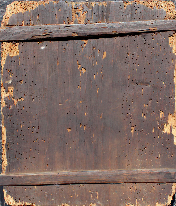 CONDITION: Minor craquelure, scattered abrasions throughout, insect damage to wood, age unknown, sold as is.