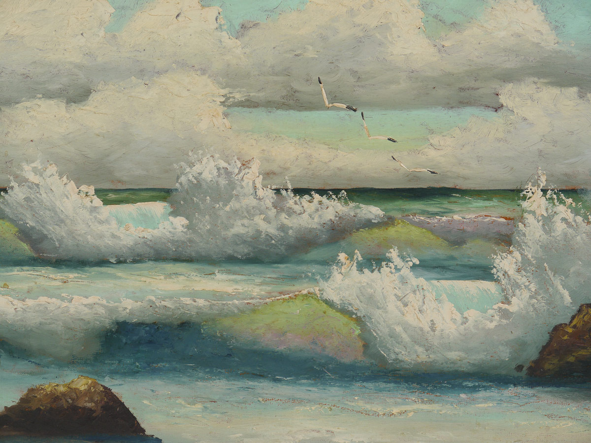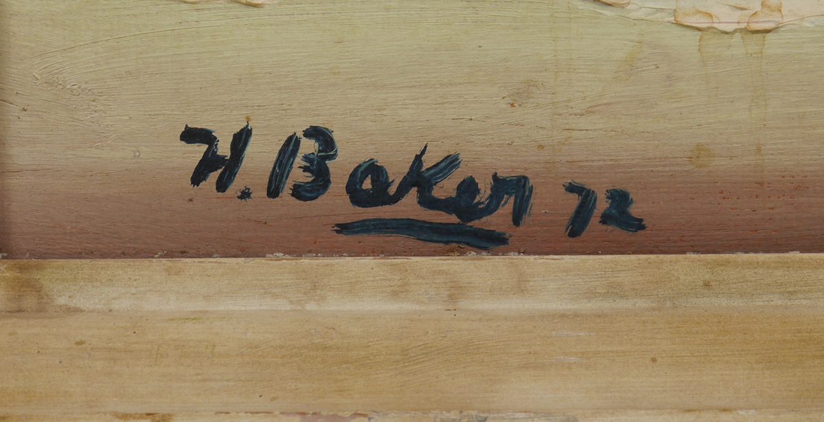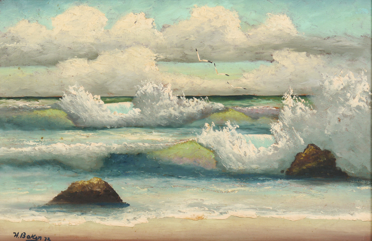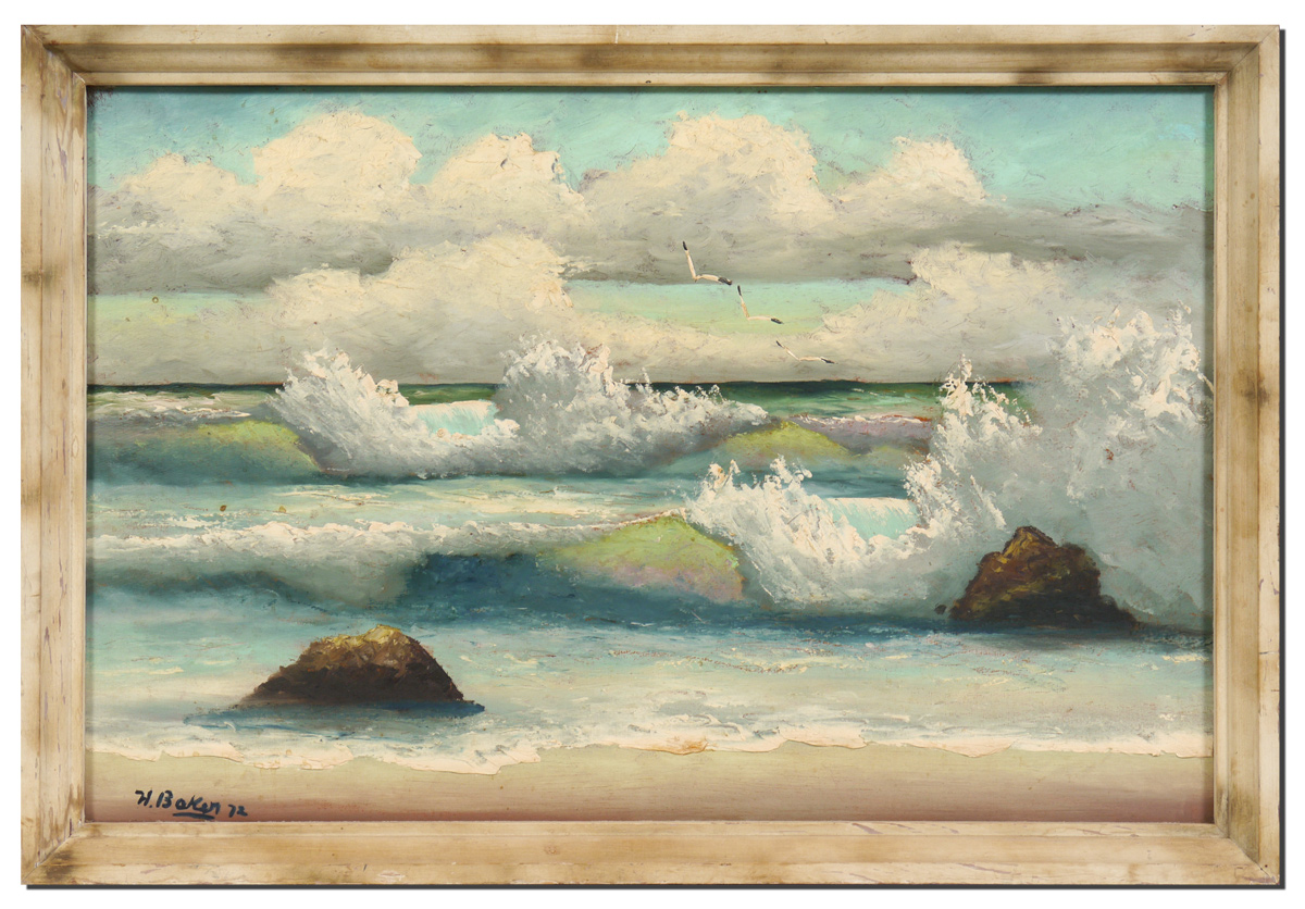 BAKER, Hezekiah (American, 1940-2007): Florida Highwaymen crashing surf scene, OIL/Upson, signed H. Baker and dated '72 lower left, original Baker shop stamping on back. 24'' x 36 1/4'', crown molding frame, 26 3/4'' x 38 1/2''.