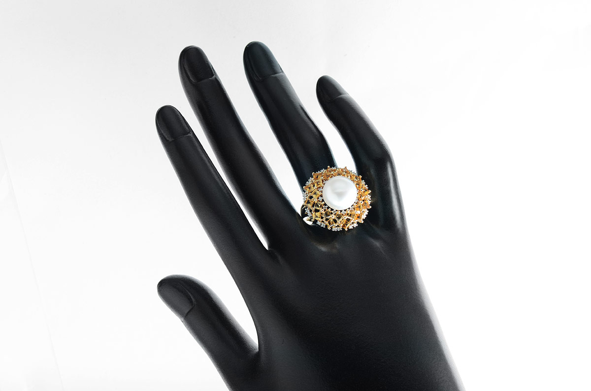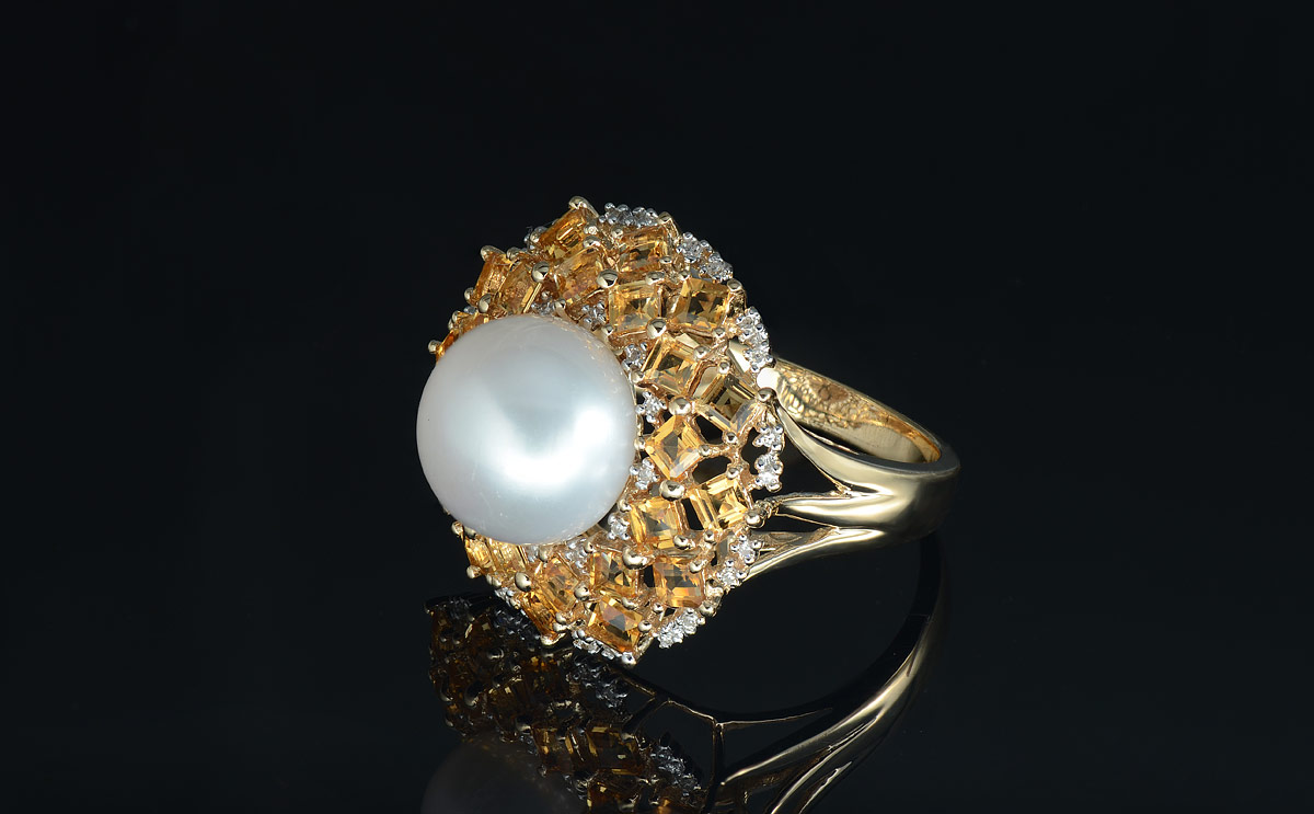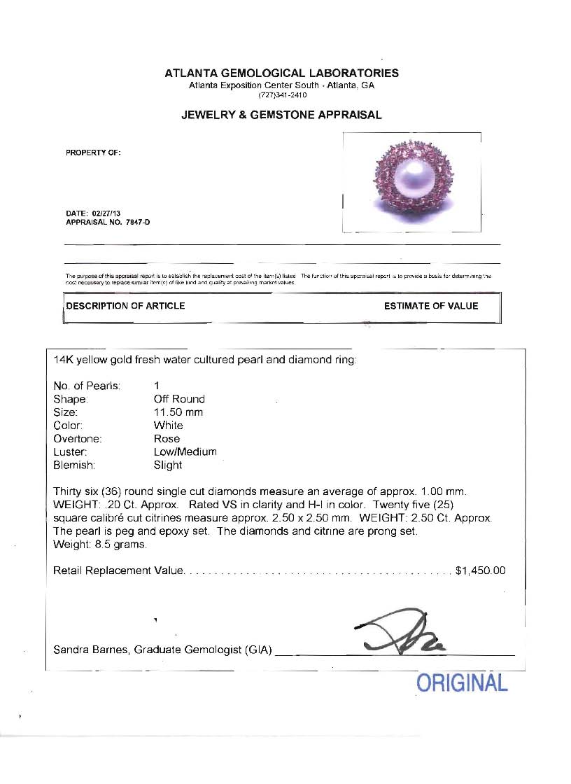 11.5 MM PEARL RING WITH DIAMONDS AND CITRINES: 14k yellow gold ring centering an 11.5 mm fresh water cultured pearl, white with rose overtones. The 36 round single cut diamonds total approx, .20 Ct. The 25 square calibre cut citrines total approx, 2.5 Ct. prong set stones, Epoxy and peg set pearl. Size 8. Weight 8.5 grams. Sold with current Atlanta Gemological GIA graduates appraisal for $1,450.