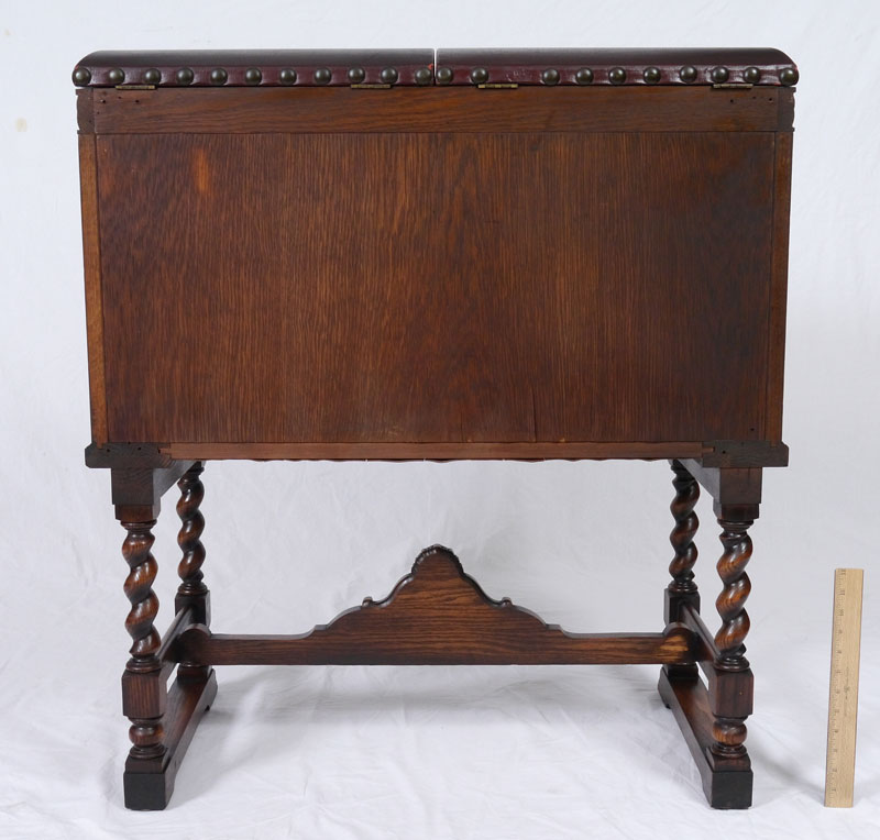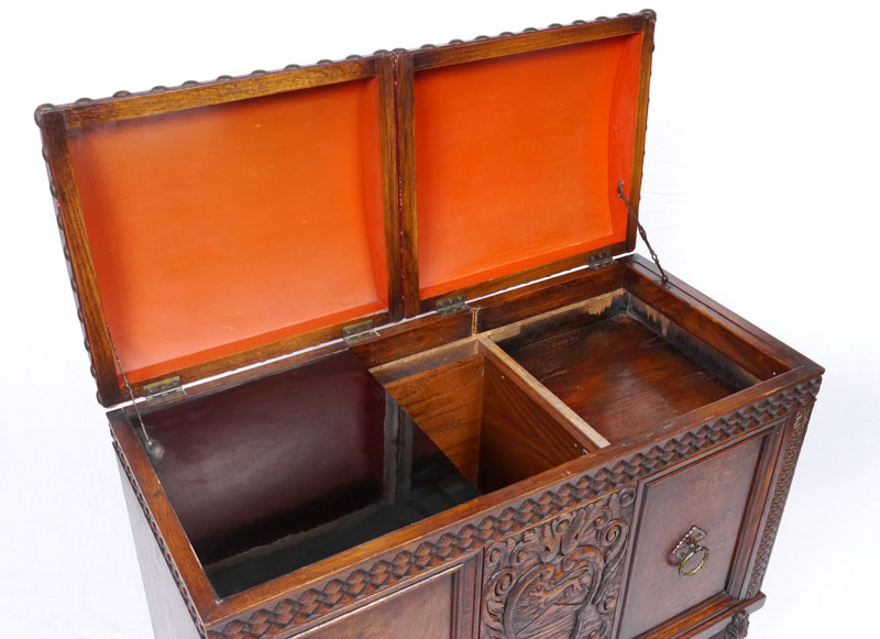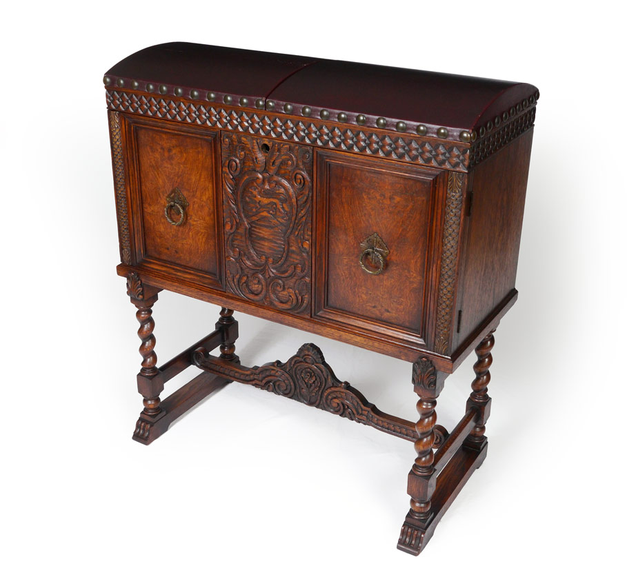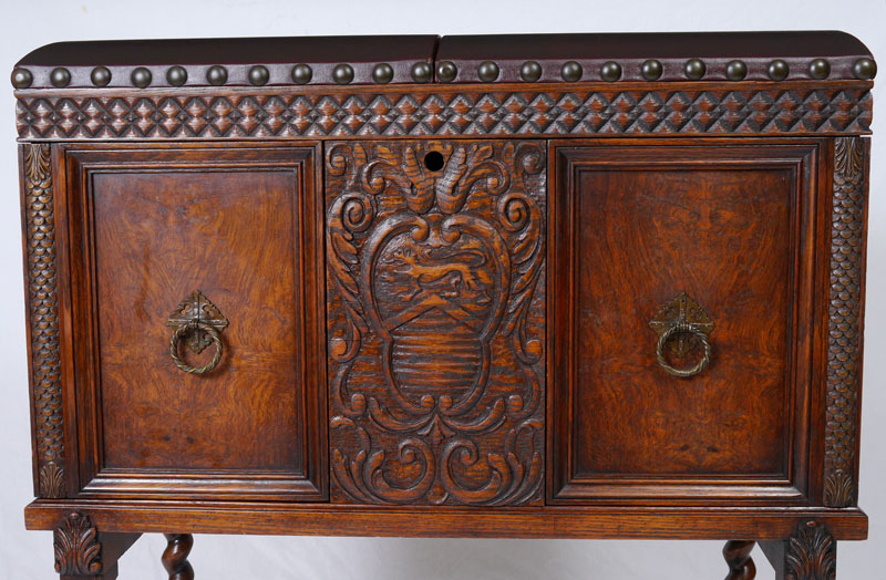 FIRESIDE FURNITURE SHOP LEATHER DOME TOP SERVER: 2 part tacked leather hinged top. 2 doors with central carved panel bottle drawer. Carved legs and supports. 36 3/4'' h. x 32 1/4'' x 15 3/4''.