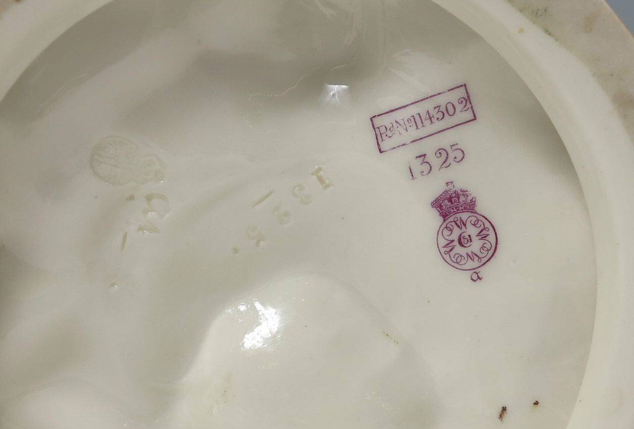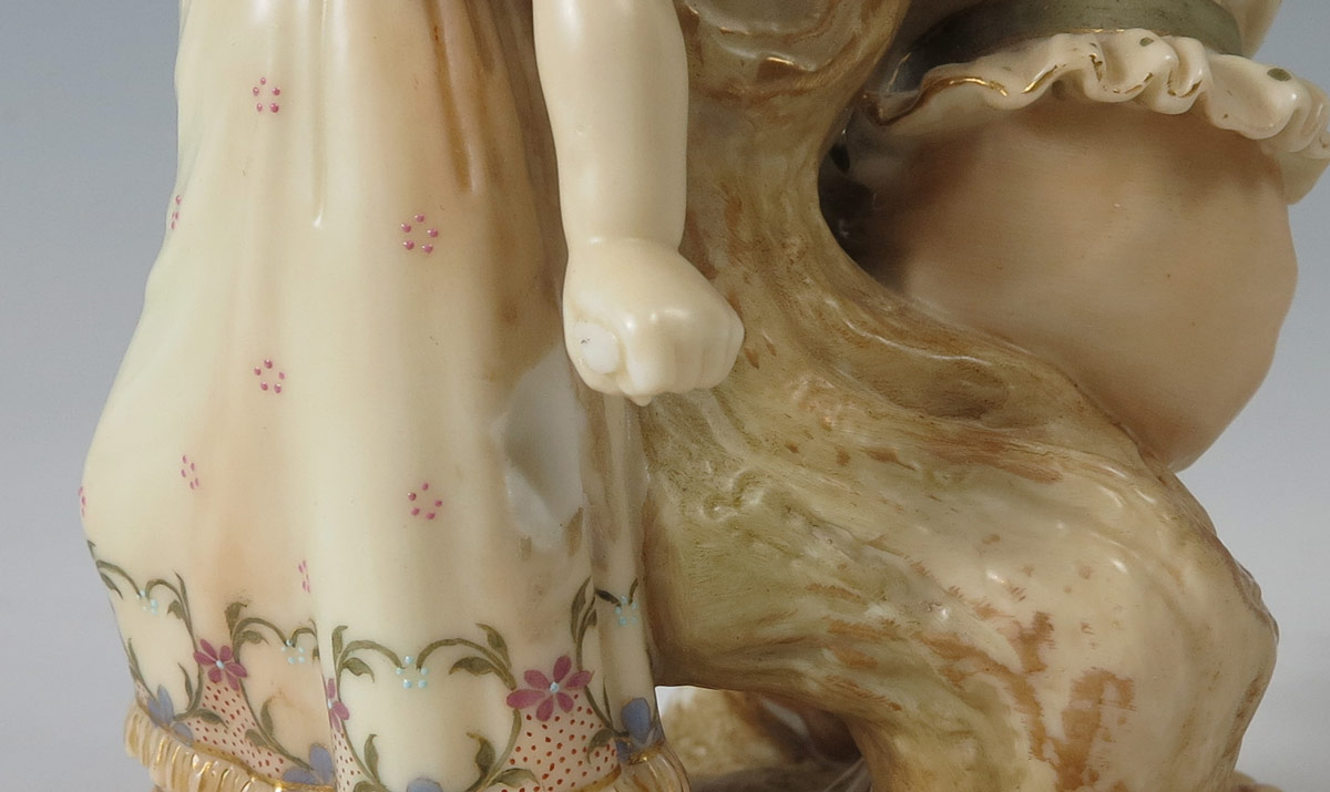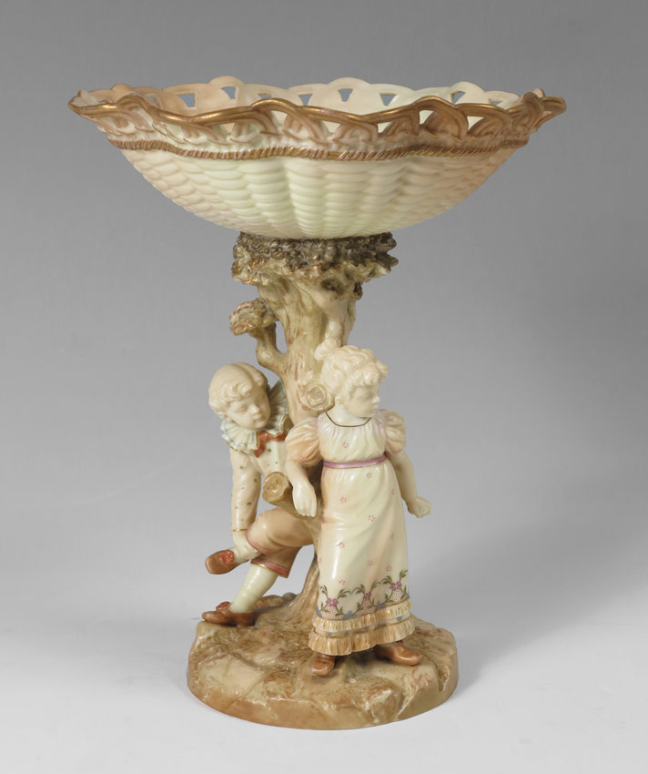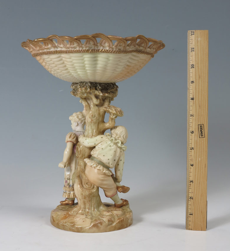 CA 1890 ROYAL WORCESTER FIGURAL COMPOTE: Reticulated basket weave bowl supported by two charming at the tree trunk. Royal Worcester and date mark for 1890. Measures 11'' tall, 8 1/2'' dia.