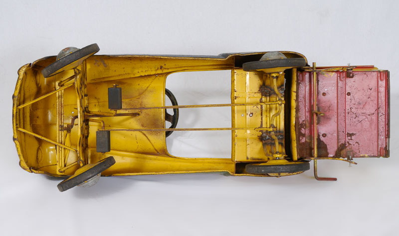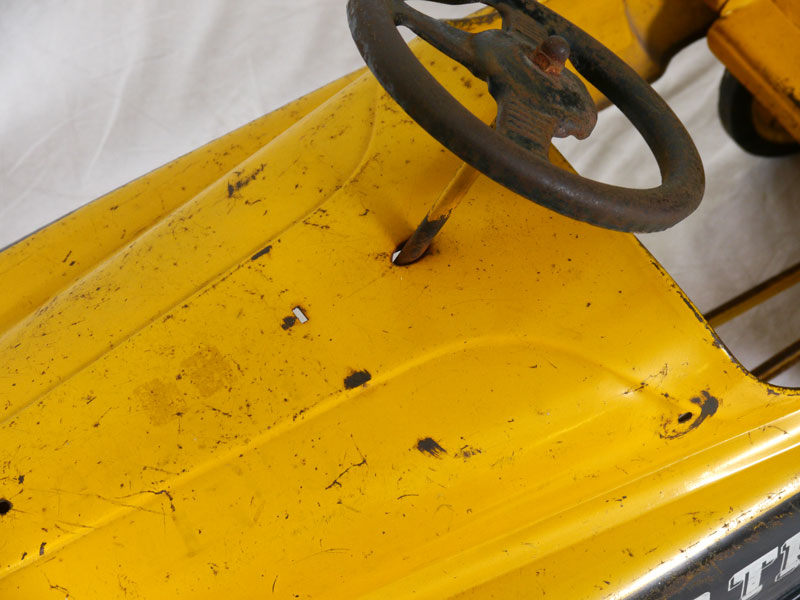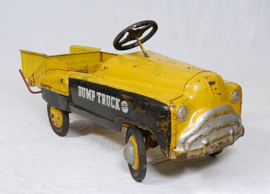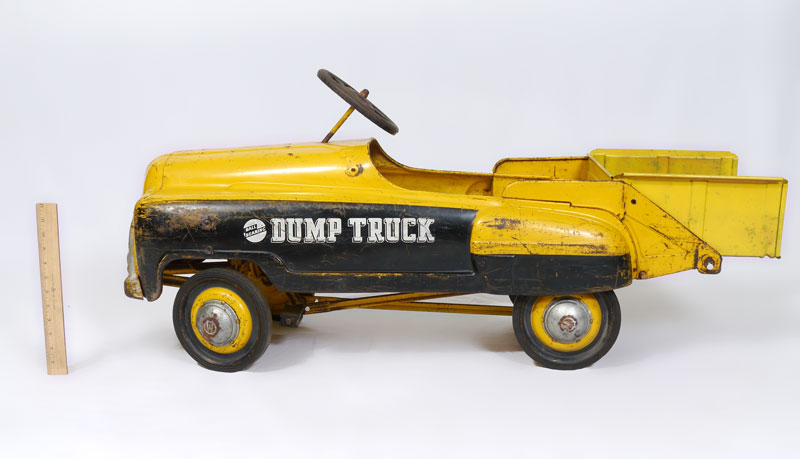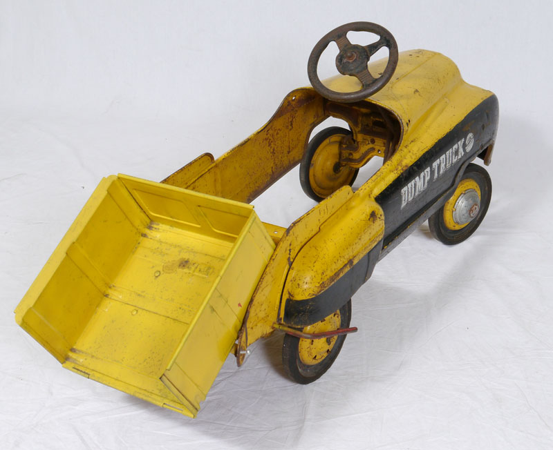 1950's SAD FACE MURRAY PEDAL CAR DUMP TRUCK: Original pedal dump truck by Murray. Measures 22'' h. x 46'' x 17 1/2''.