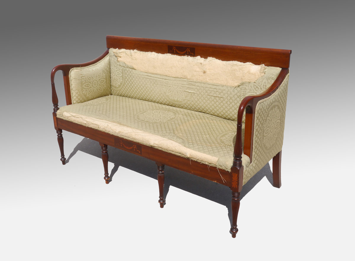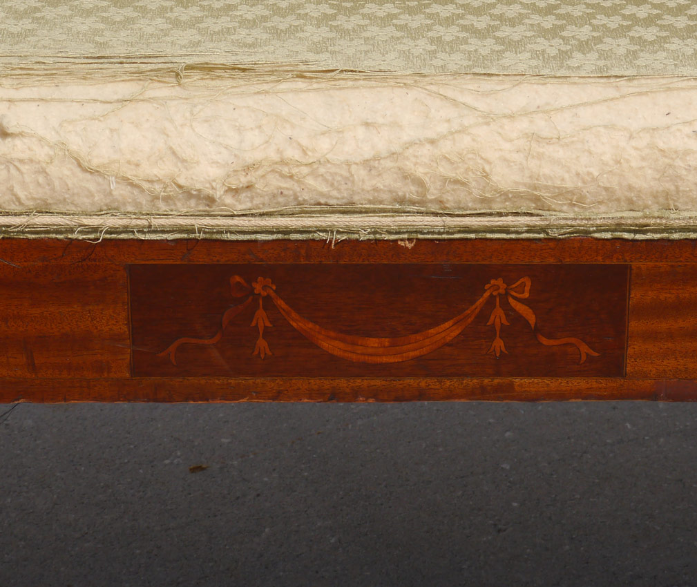 19TH CENTURY INLAID SHERATON SETTEE: Inlaid top rail and skirt with floral garland motif. Shaped arms with swan neck hand holds over fluted supports. Fluted and turned front legs. 36 1/4'' h. x 60 1/2'' x 23 1/2''. Doris Baker-Mansergh Estate