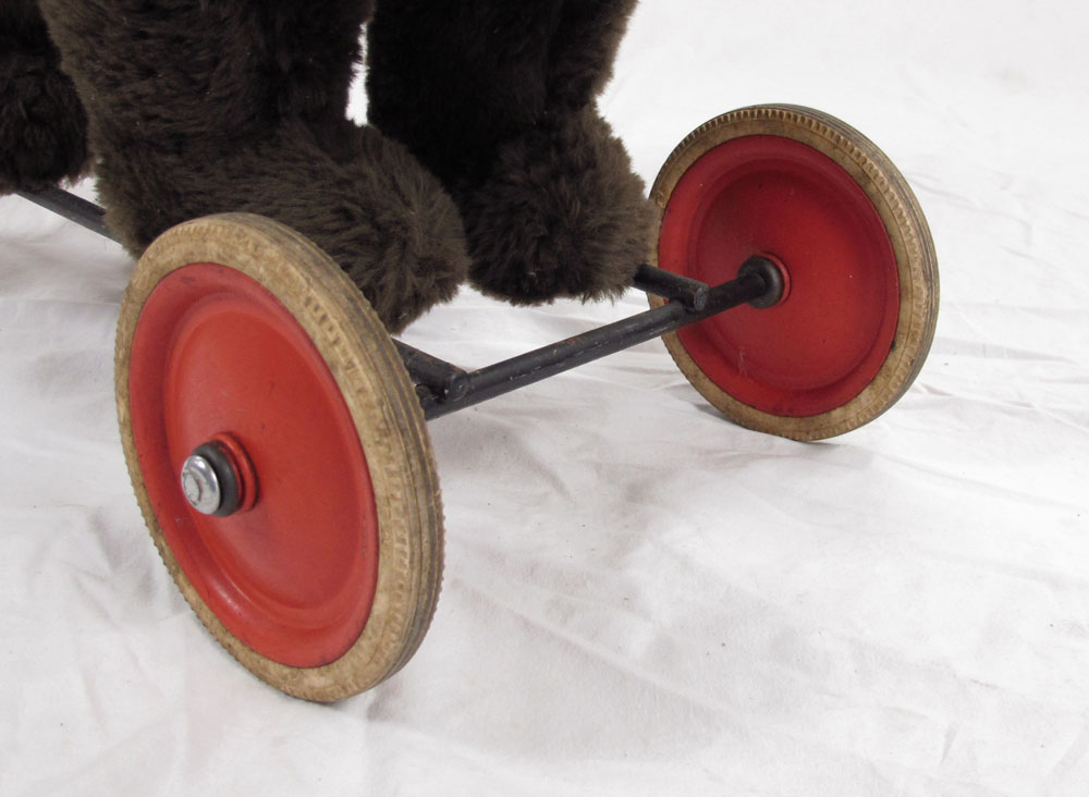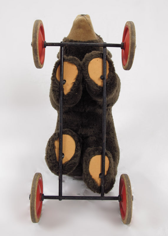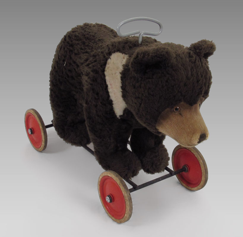 STEIFF RIDE ON BEAR CUB: 1950's button, brown fur with white collar. No tag. 19 1/2'' h. x 26 1/2'' x 11 1/2''.