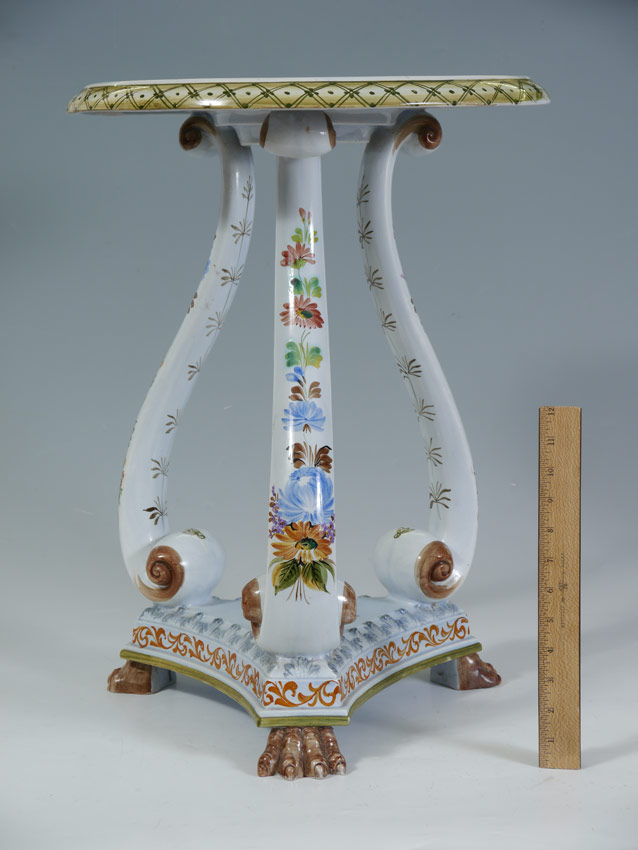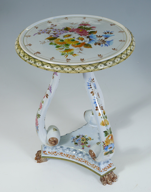 ITALIAN PORCELAIN SIDE TABLE: Floral decorated with 3 scroll supports, paw feet. Unmarked. Measures 23'' h. x 17 1/2''.