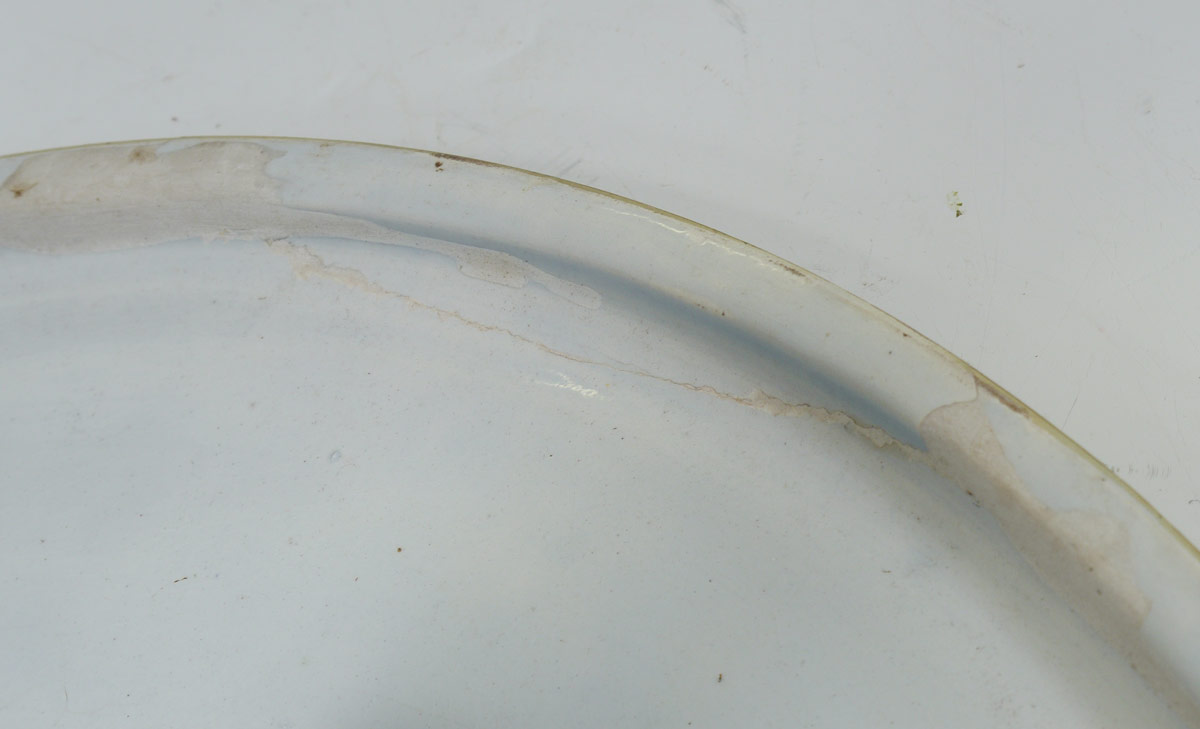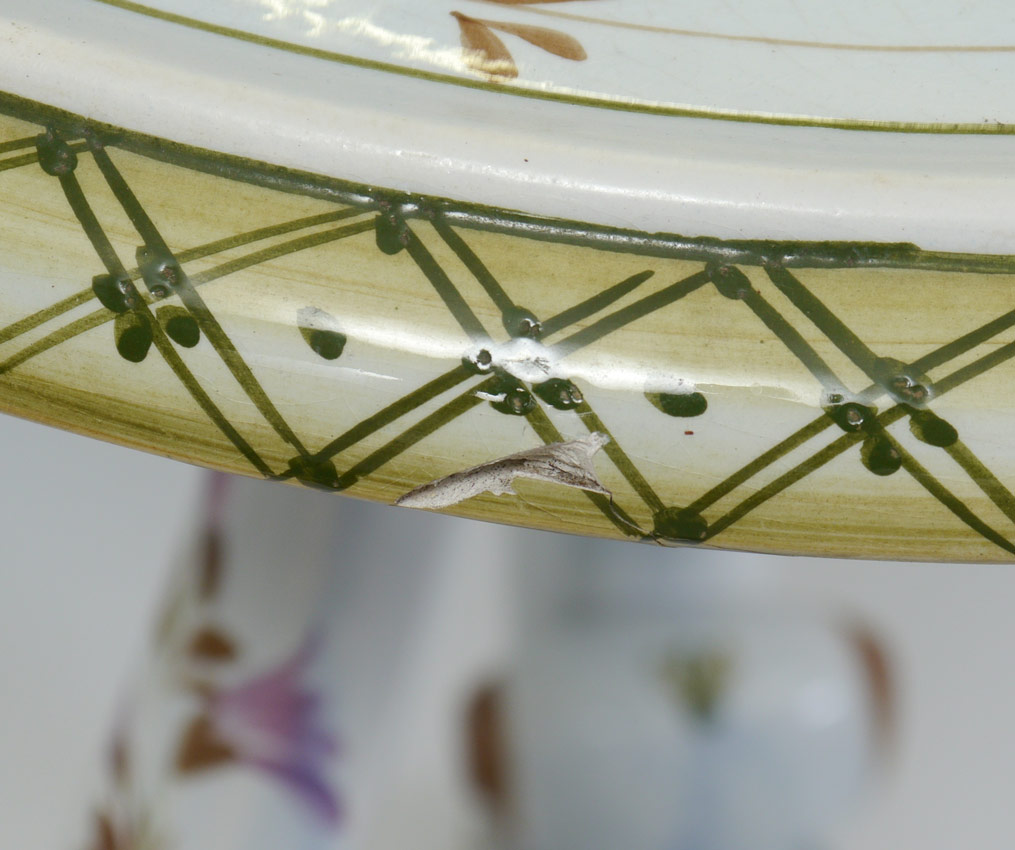 CONDITION: Note chip and abrasions to top, repair at base of one support, crazing.